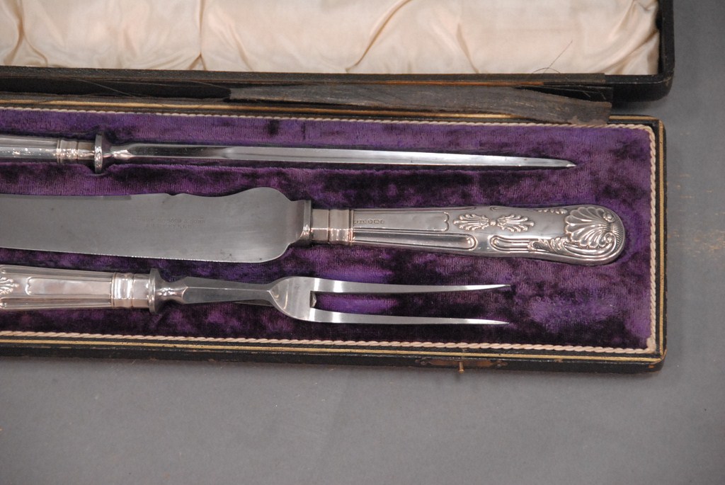Three piece cutlery set in fitted box with silver handles.