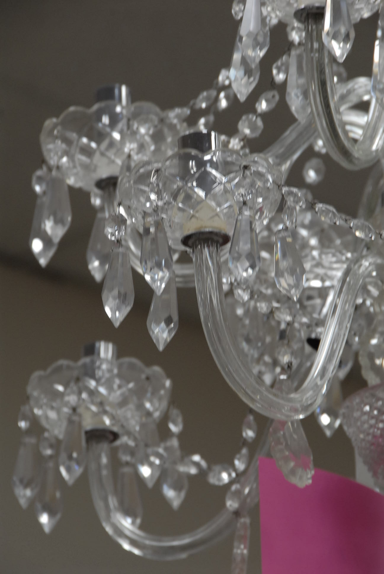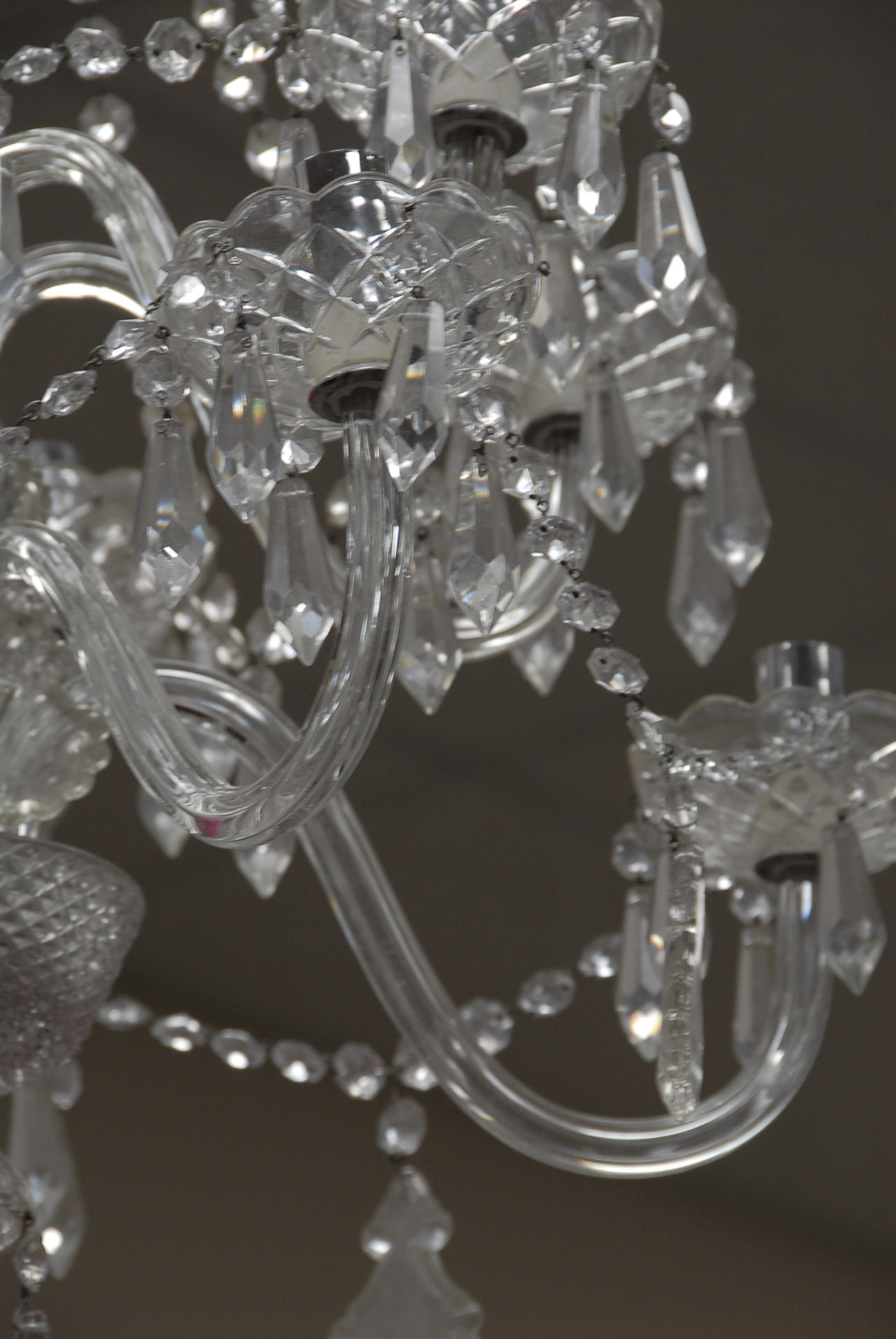 Lot 222: Twelve light crystal chandelier, one arm as is