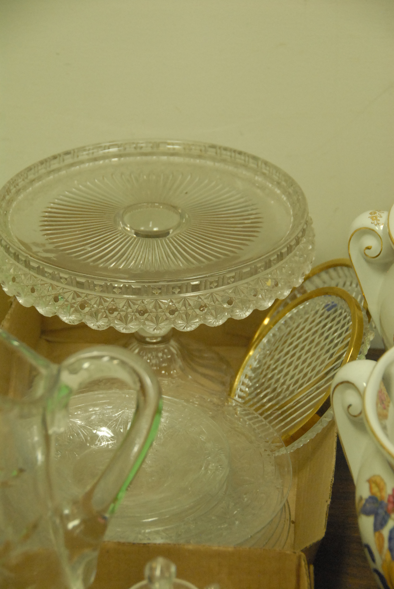 Two box lots to include cut glass pitcher, cut crystal, two cut glass decanters, cut glass box, knife rest, etc.