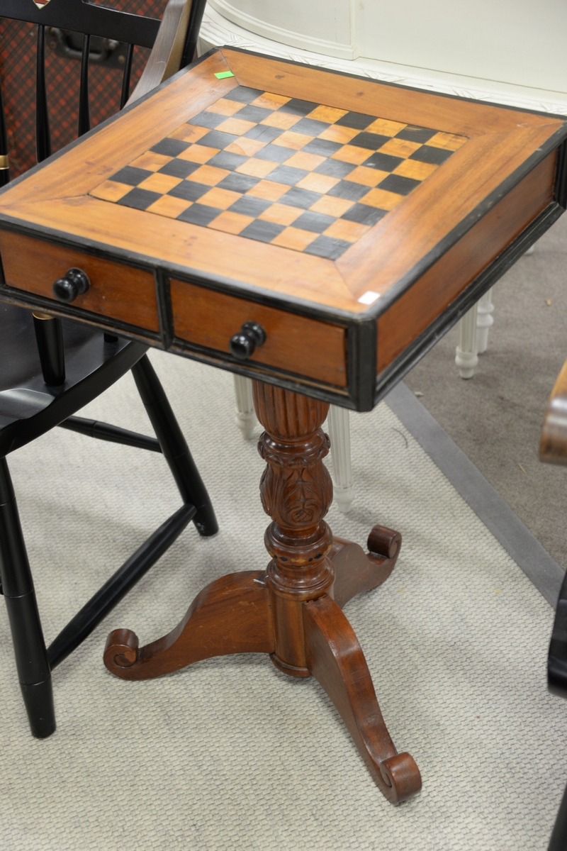 Lot 222: Two piece lot to include a chess board game table and a kneehole desk. table: ht. 30in., top: 19 x 19 and desk: ht. 30in., top: 22…