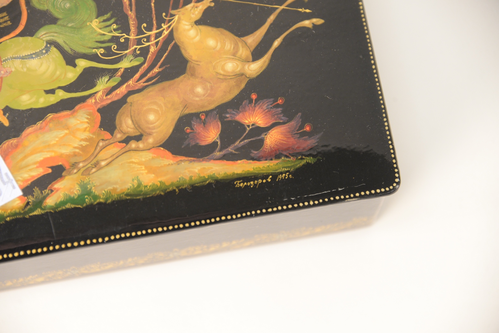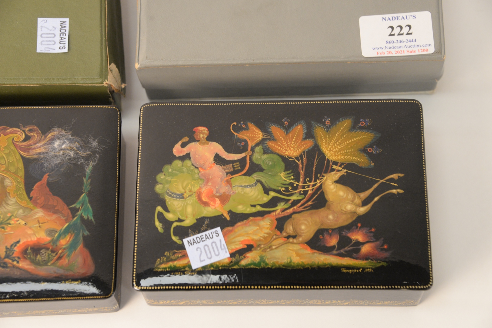 Lot 222: Two Russian Lacquer Boxes, having legends and fairy tale motif, manner of Palekh School, marked, signed 1979 A. Kysnaud?, and Tberozepol?, 1975; both having original boxes, marked Made in USSR Kyrehnp, tops 4″ x 6″. Provenance: The Estate of Alina Roisen, Park Avenue, New York.