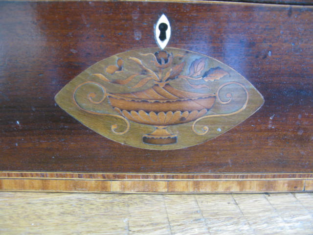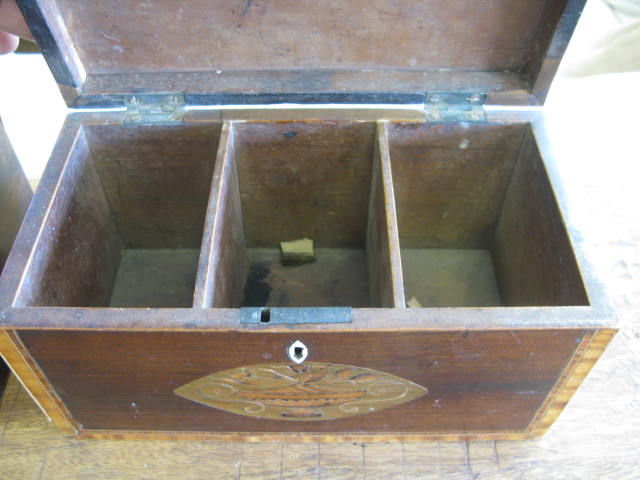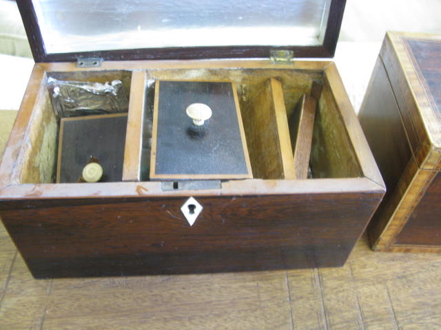 Two tea boxes, one rosewood one with light colored inlaid urn on top and side