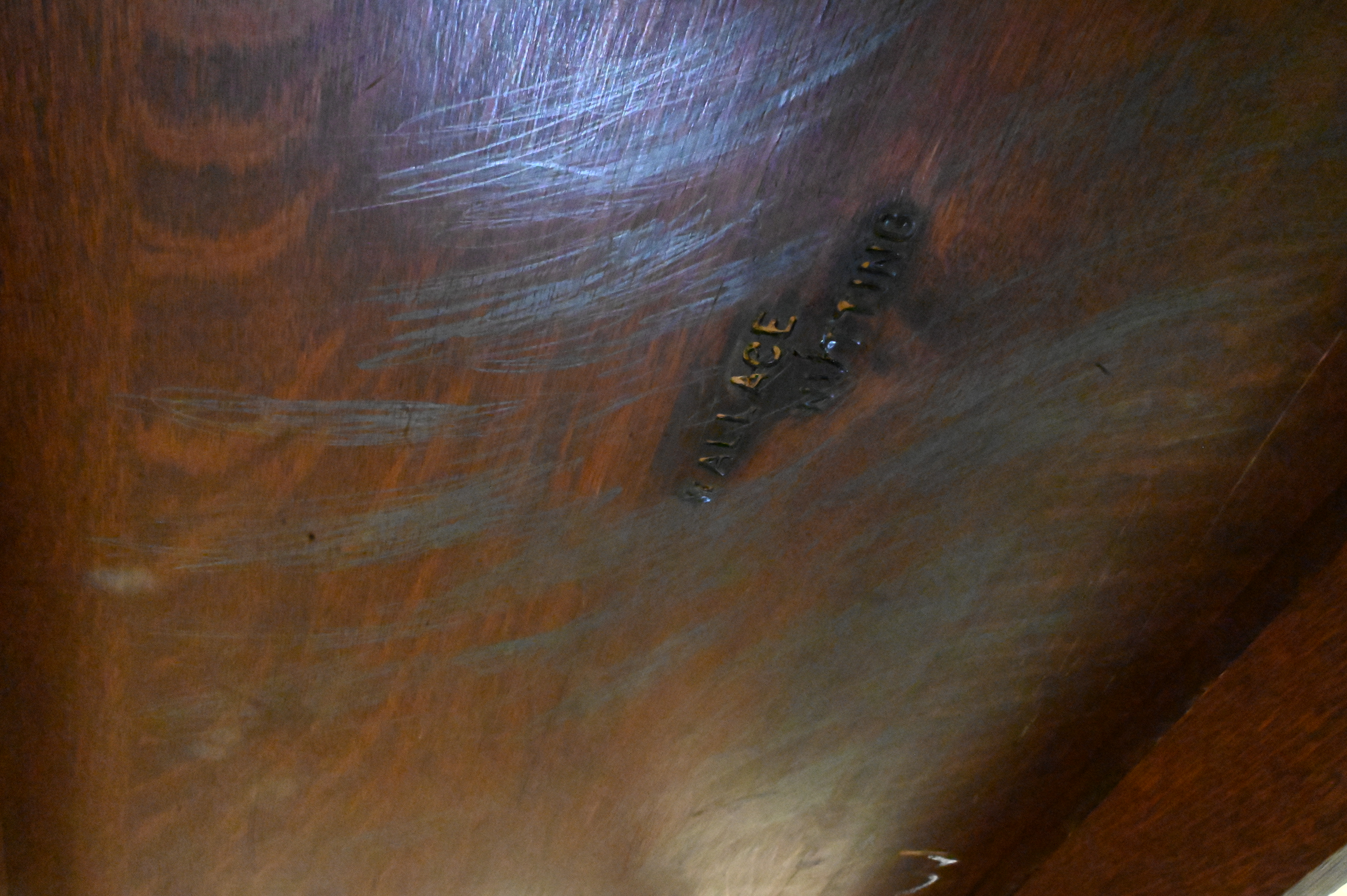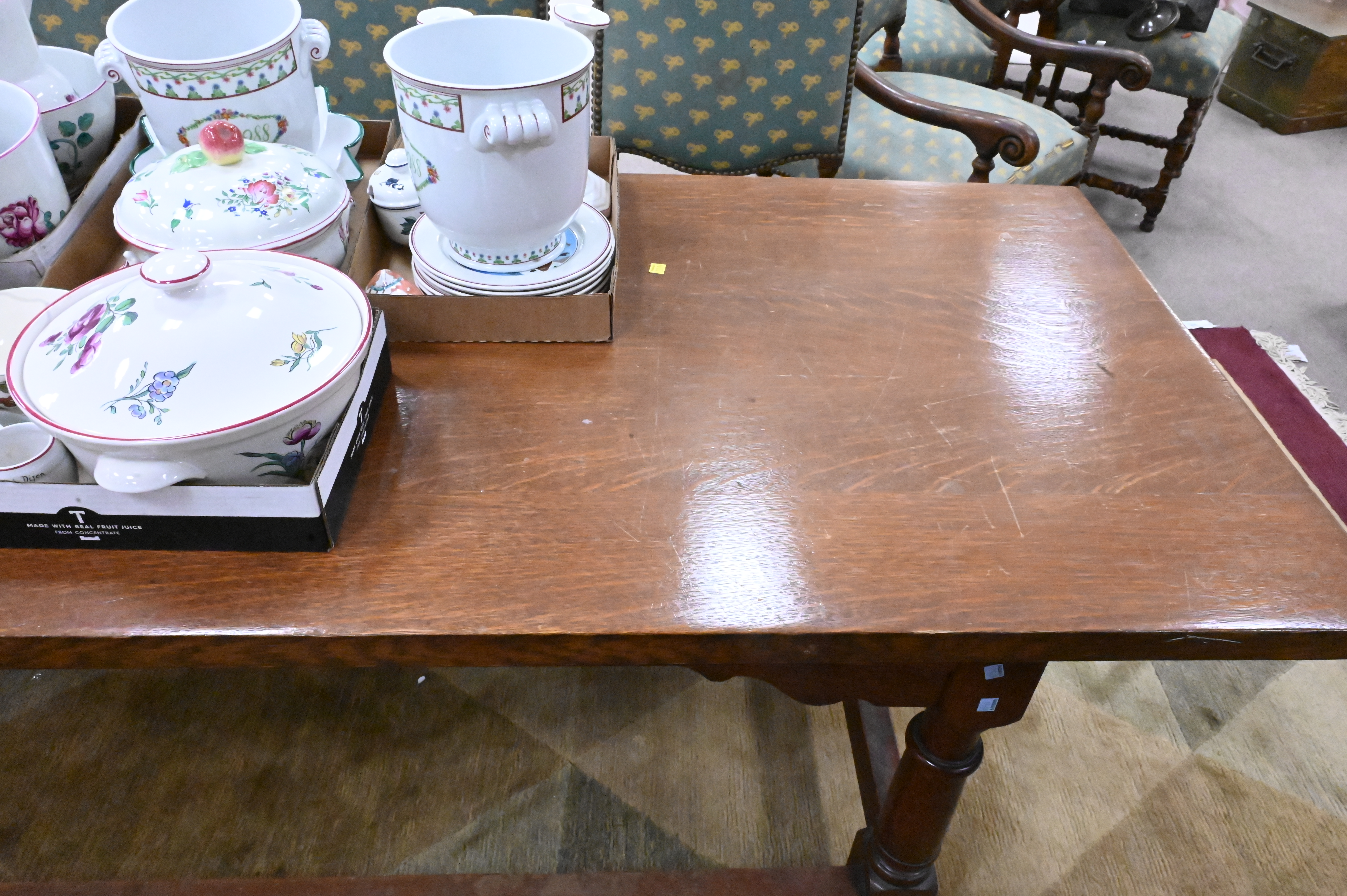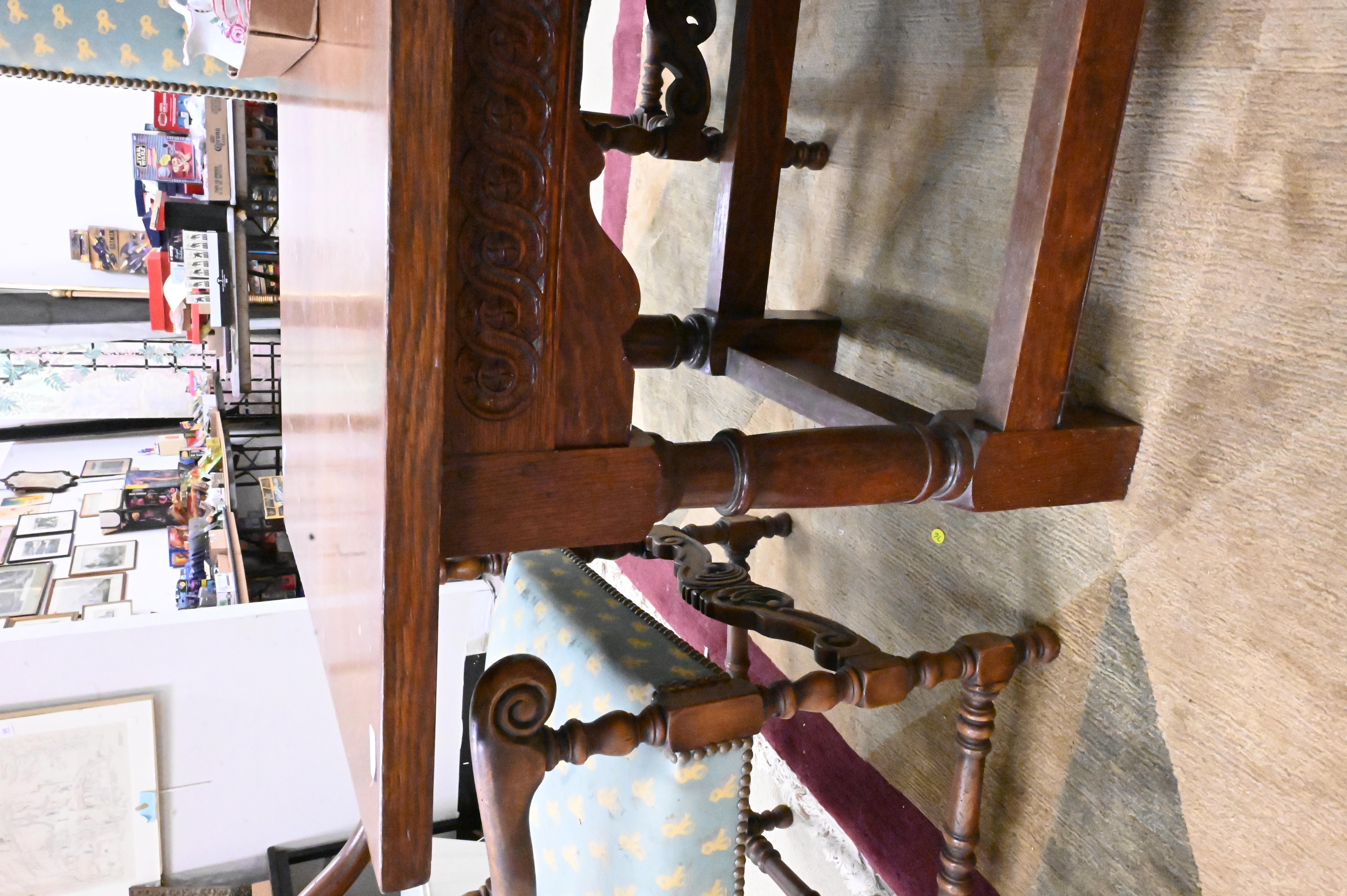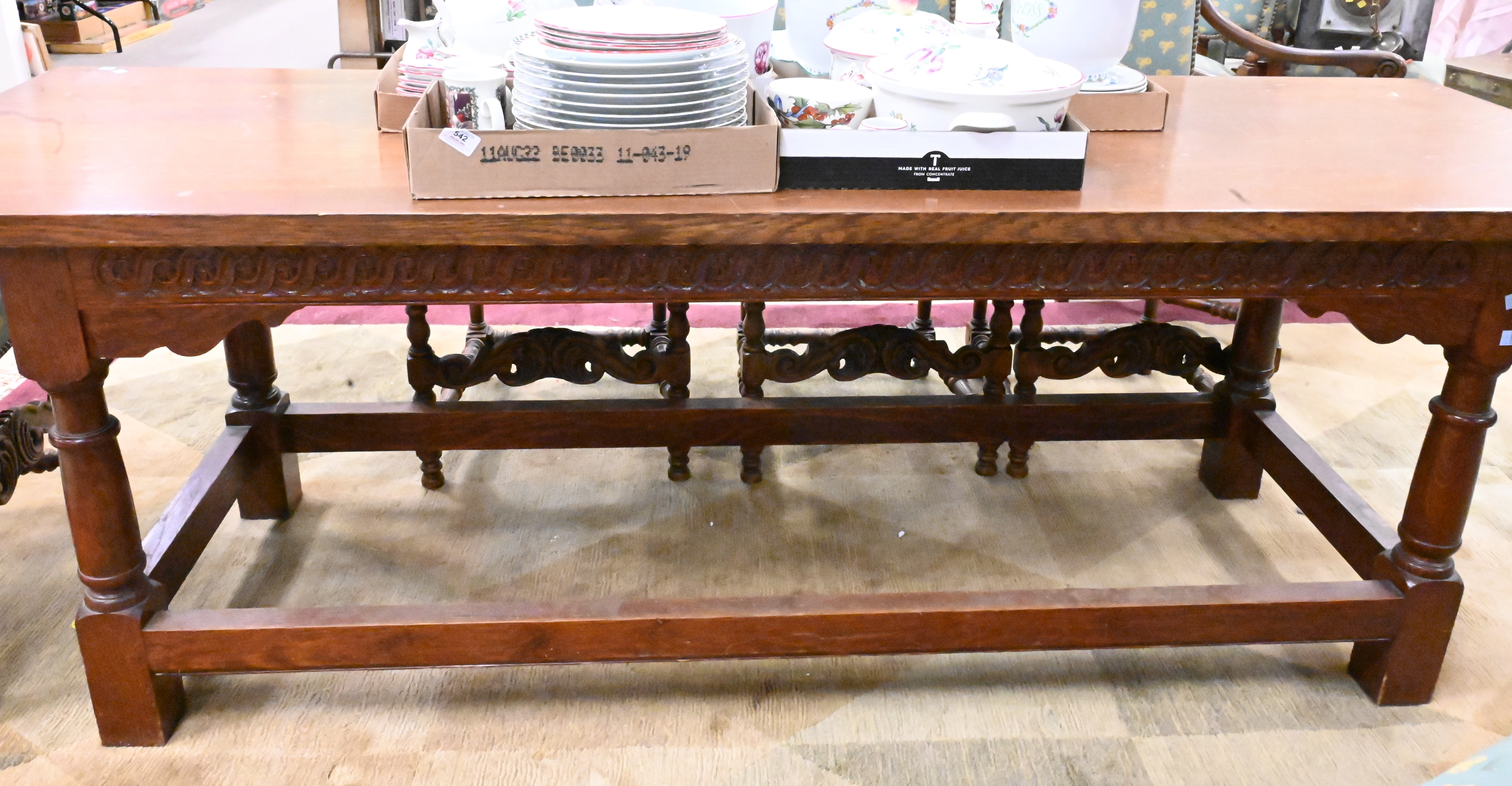 Wallace Nutting Oak Refectory Table, having slab top set on pinned base with carved frieze, height 30 inches, top 30″ x 90″ .