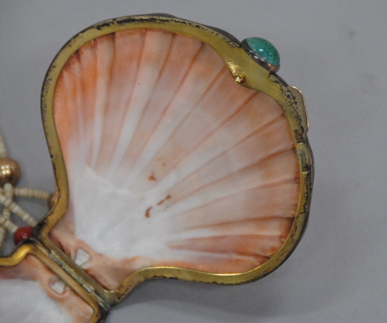 Bead necklace with scallop shell container trimmed with silver, marked sterling stix.