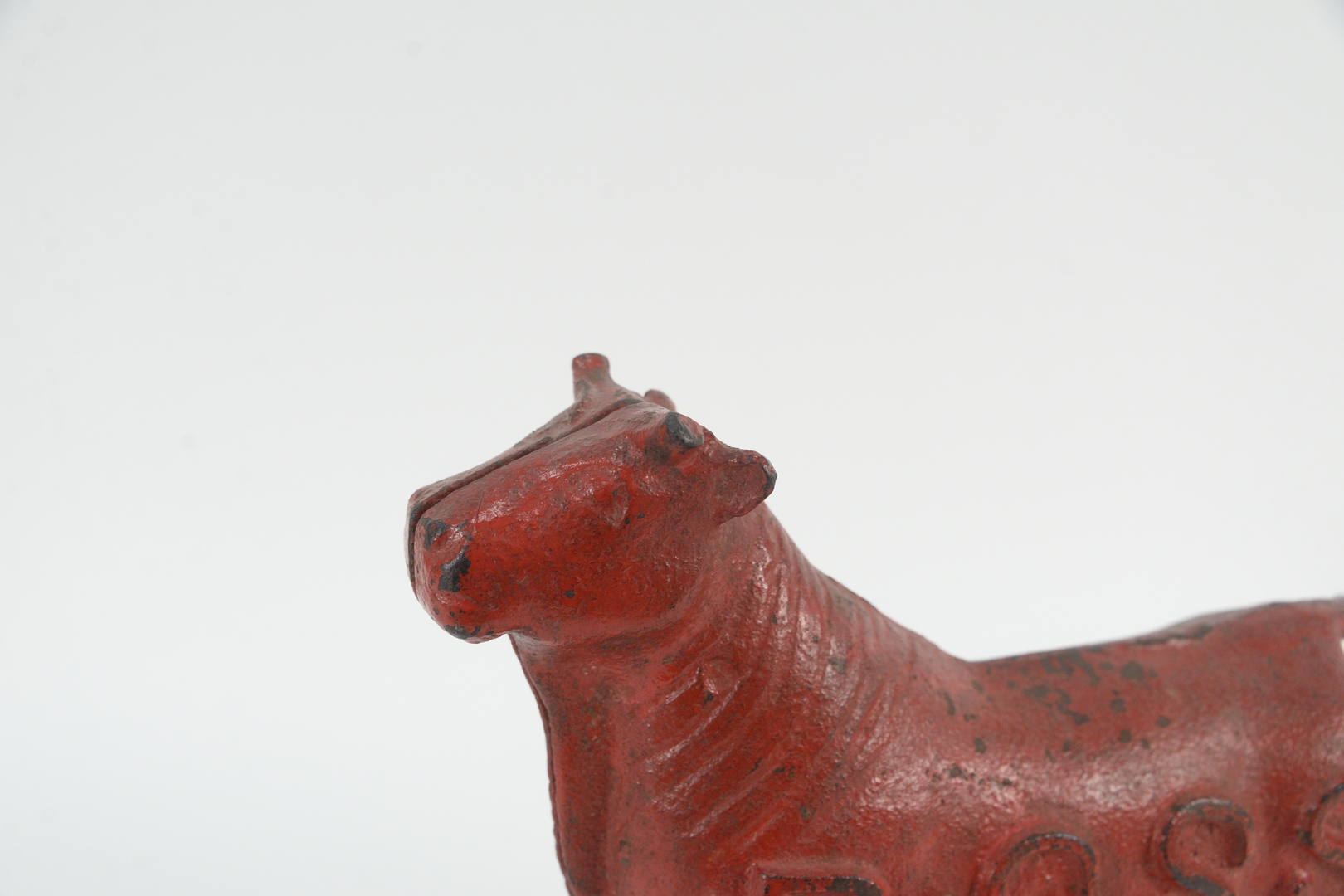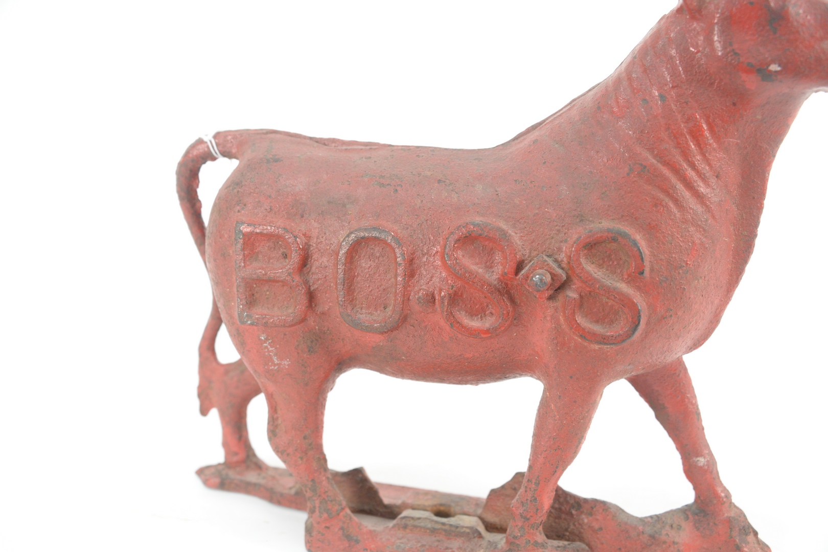 Lot 223: Boss Steer Cast Iron Windmill Weight, painted red and marked Boss on each side, height 12 inches, width 4 inches, length 14 inches.