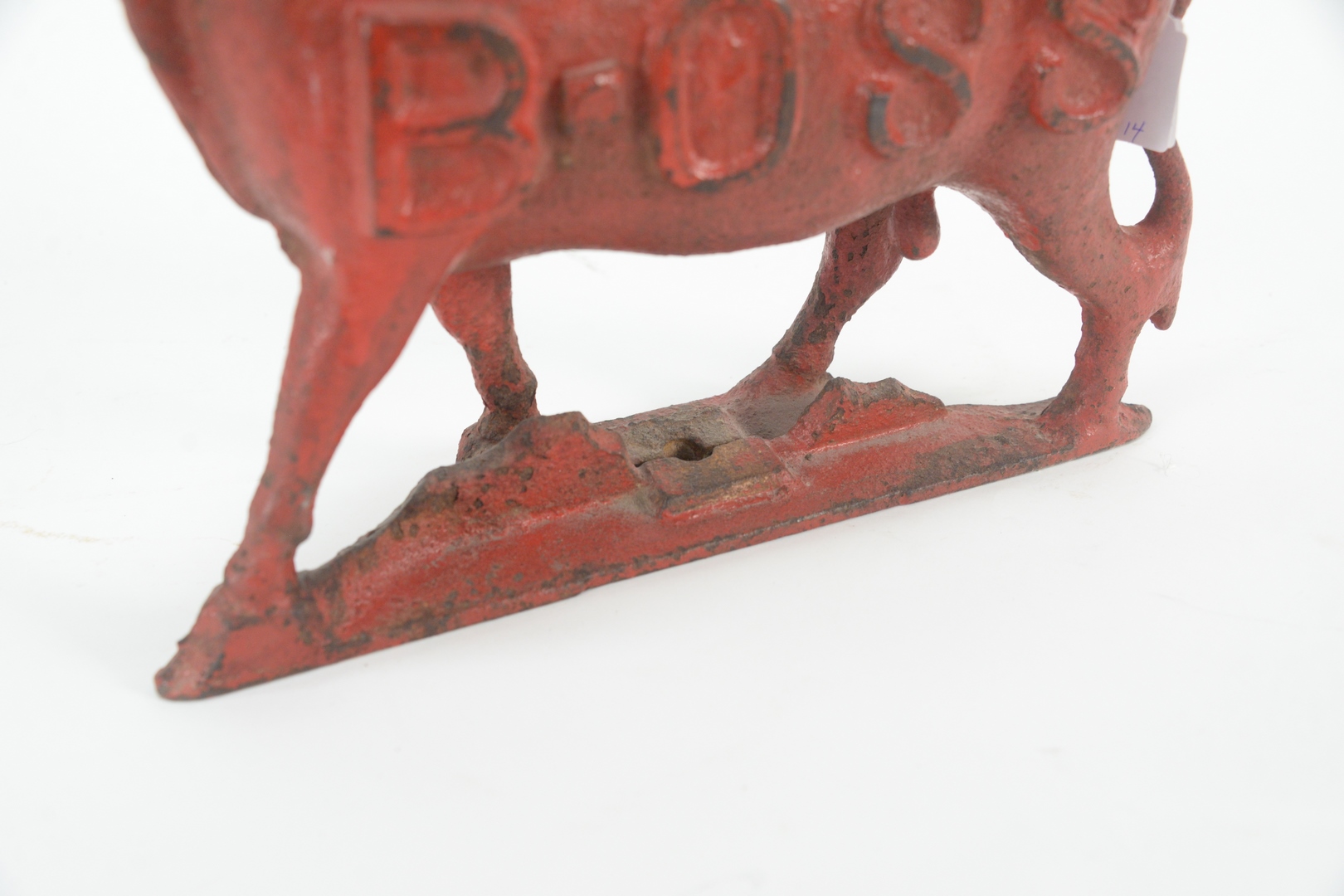 Boss Steer Cast Iron Windmill Weight, painted red and marked Boss on each side, height 12 inches, width 4 inches, length 14 inches.