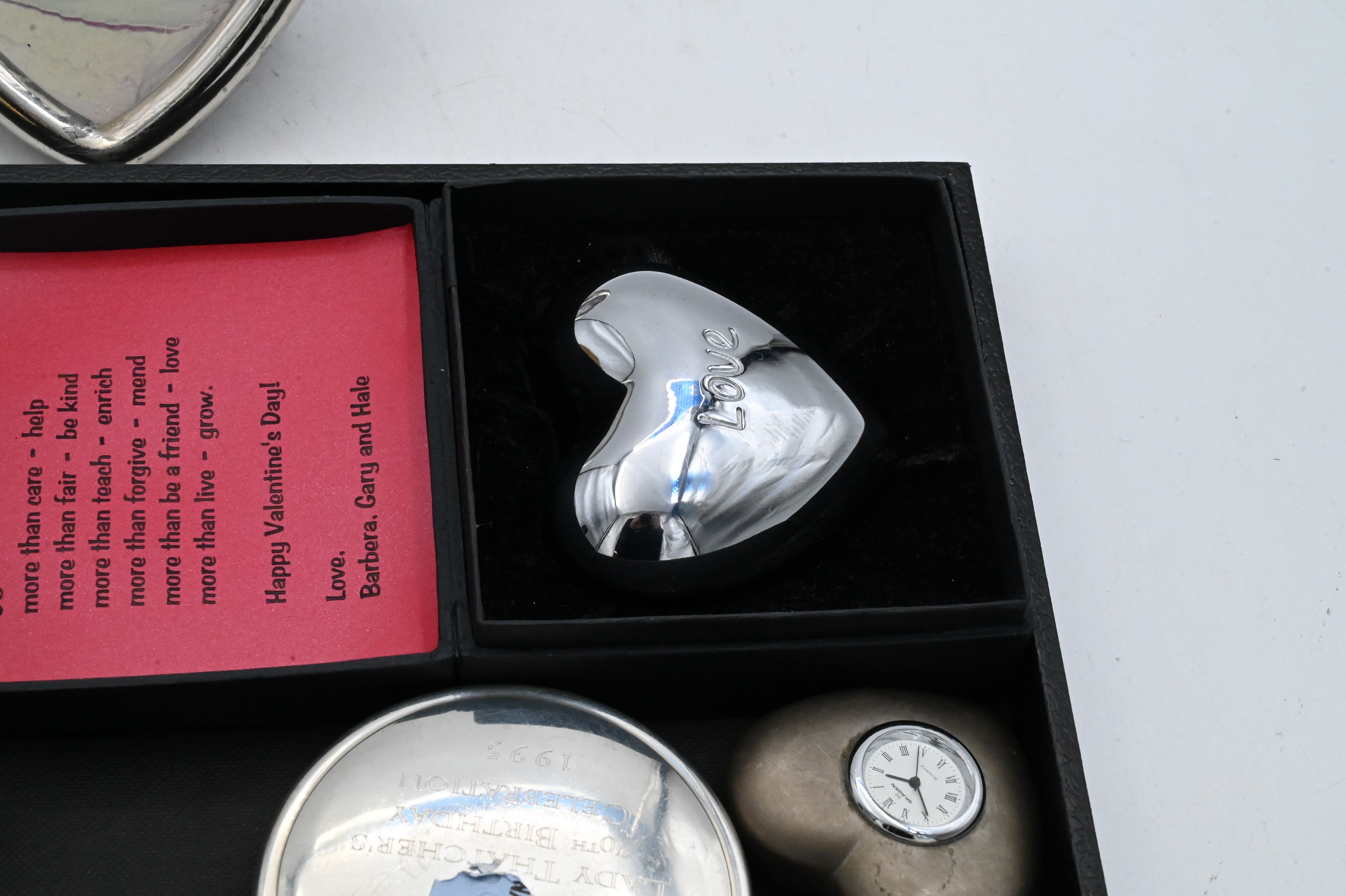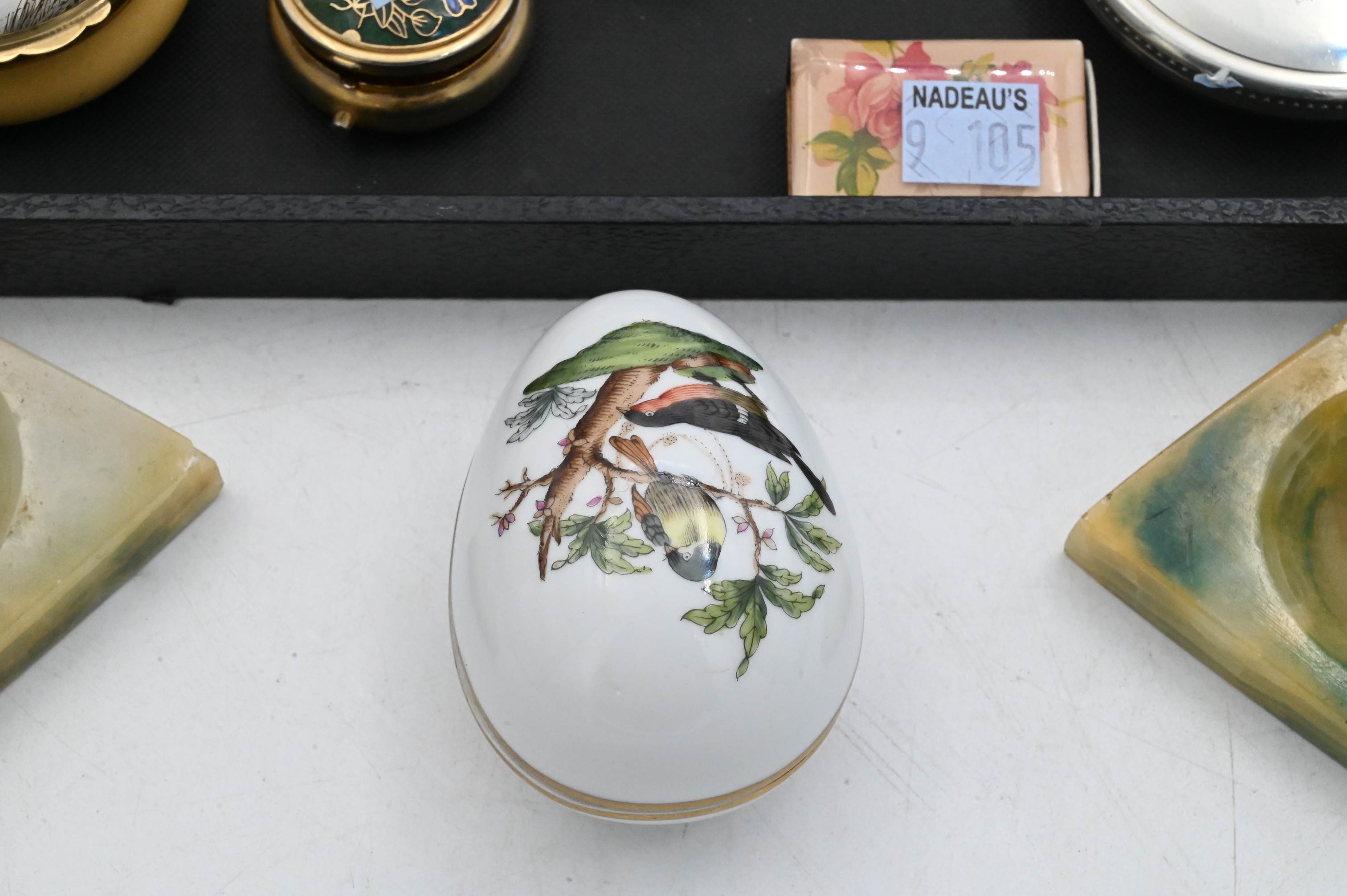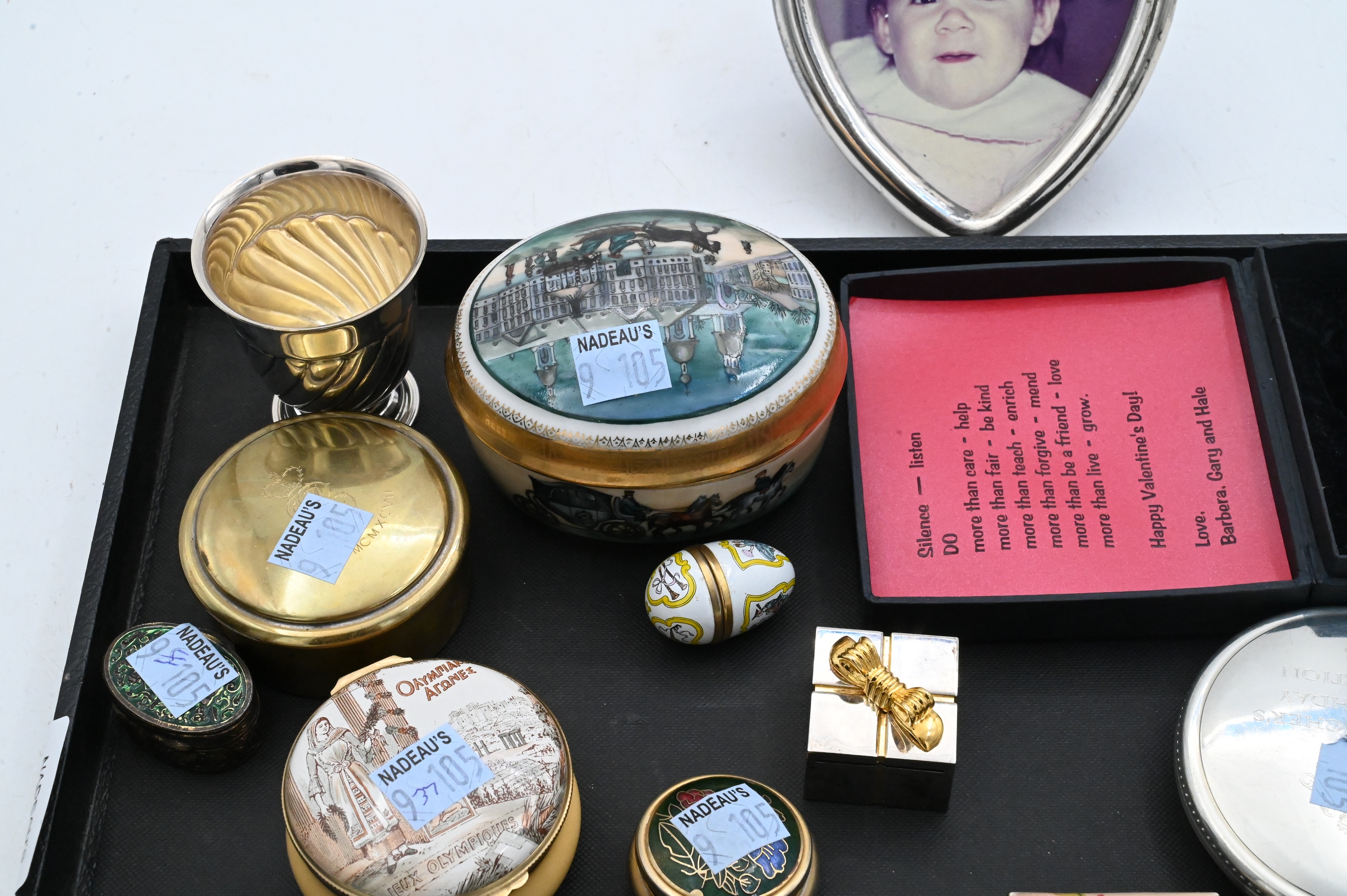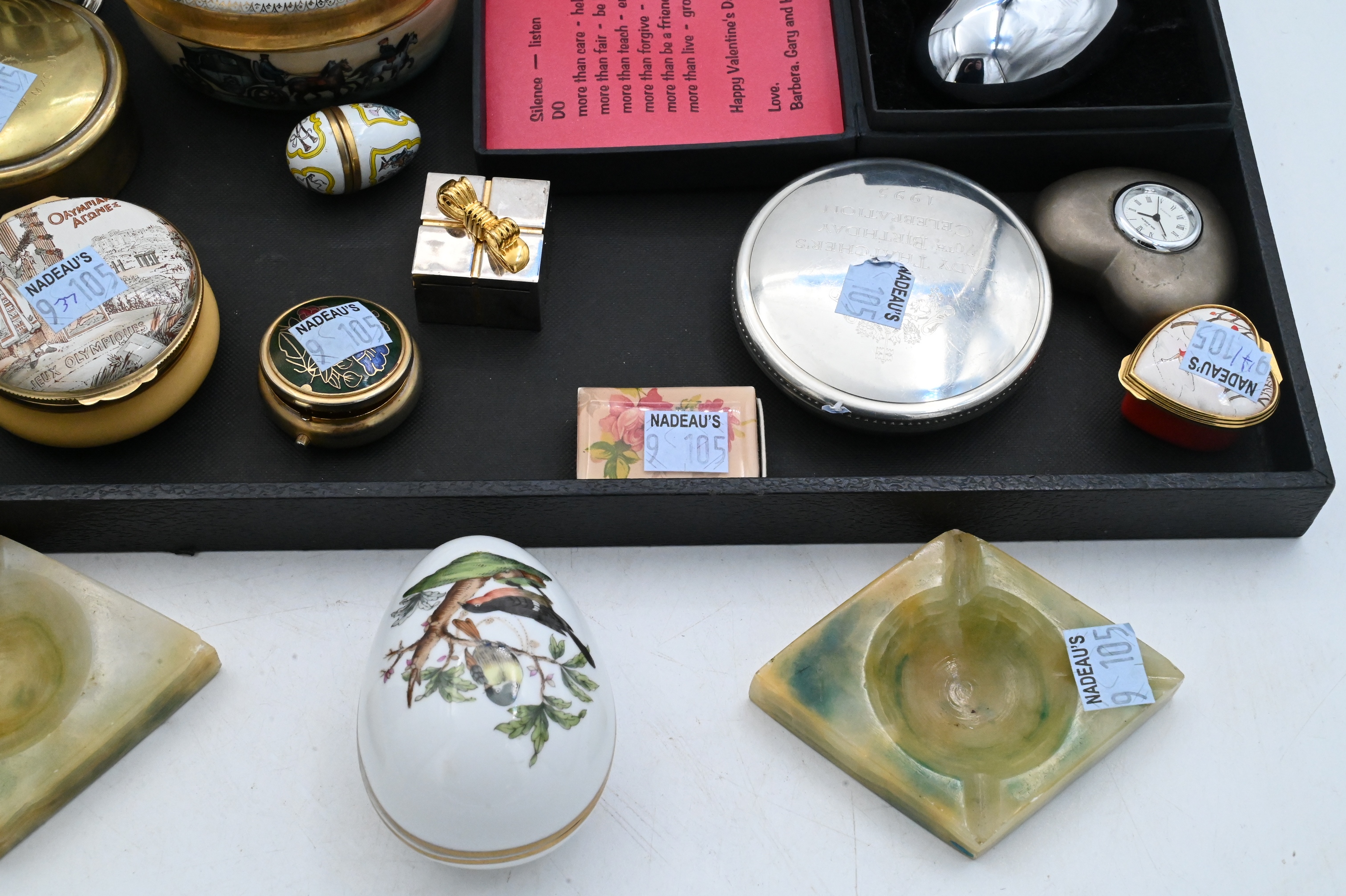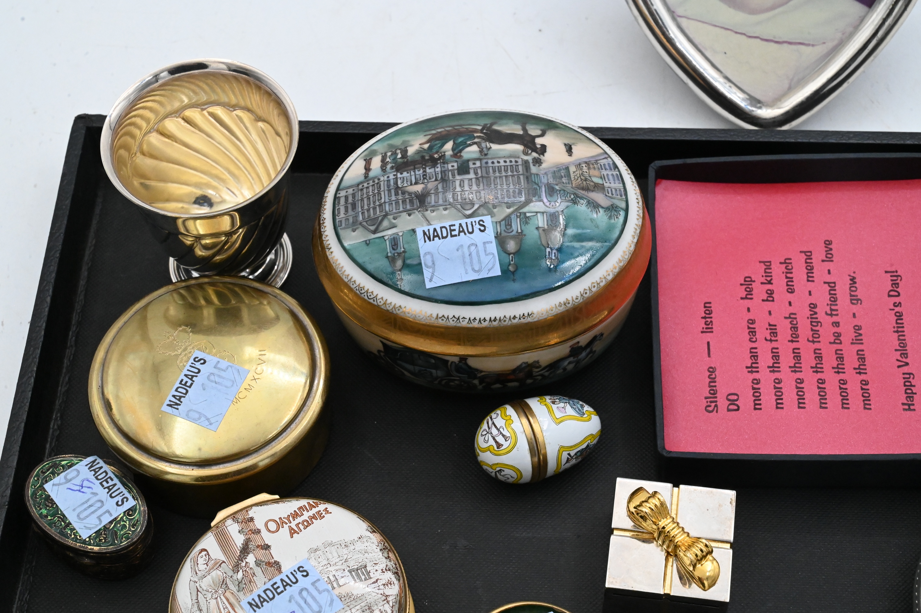 including Halcyon Days and Herend, one painted with a coaching scene, another egg-form example with floral and bird decoration, and a Herend “Lady Thatcher 70th Birthday Celebration” commemorative box, 1995. Together with a Tiffany & Co. pewter heart-form box inscribed Love, along with assorted miniature clock-form and gilt metal heart boxes