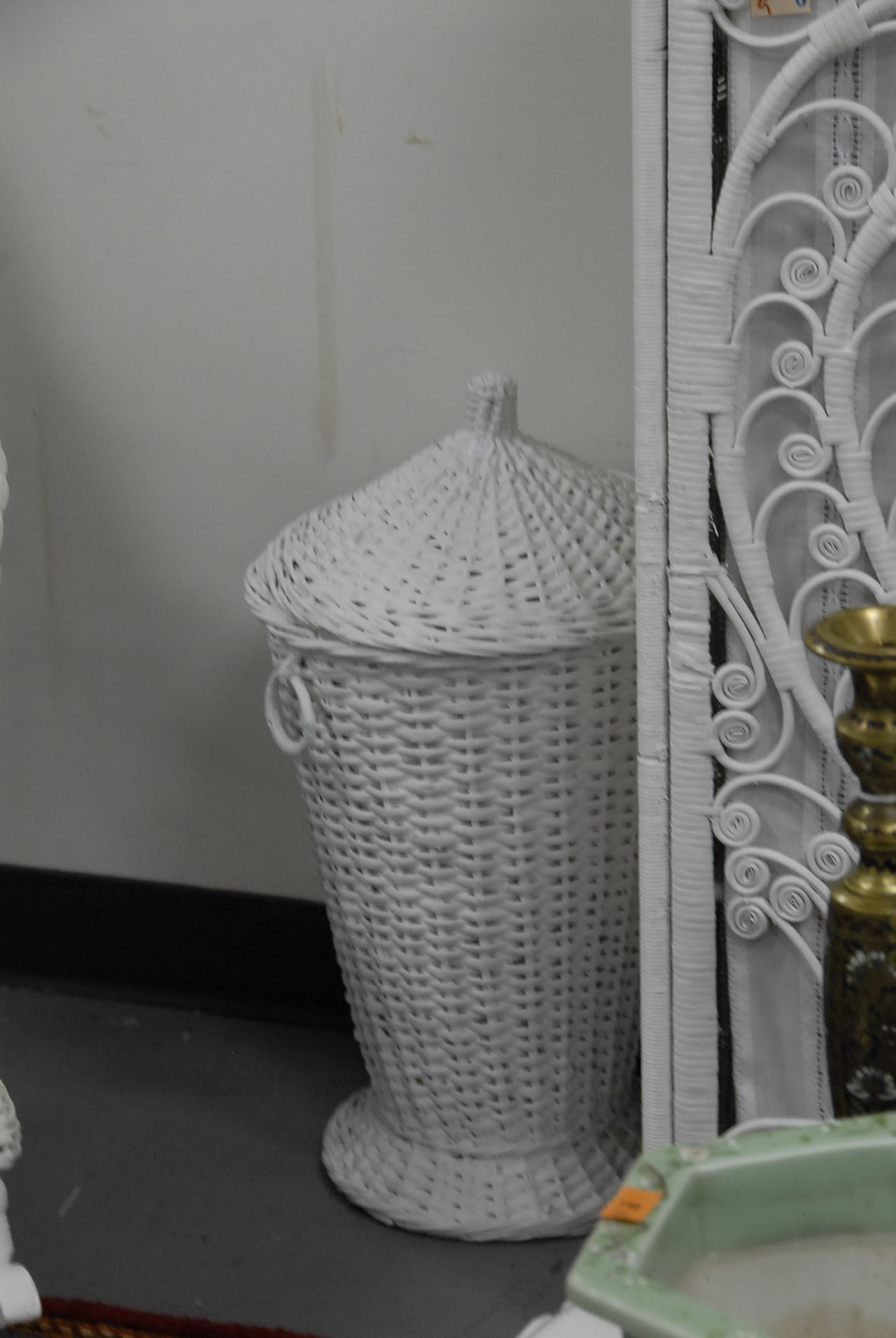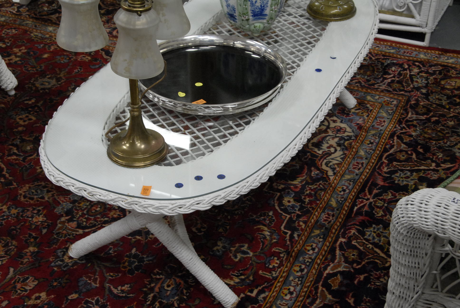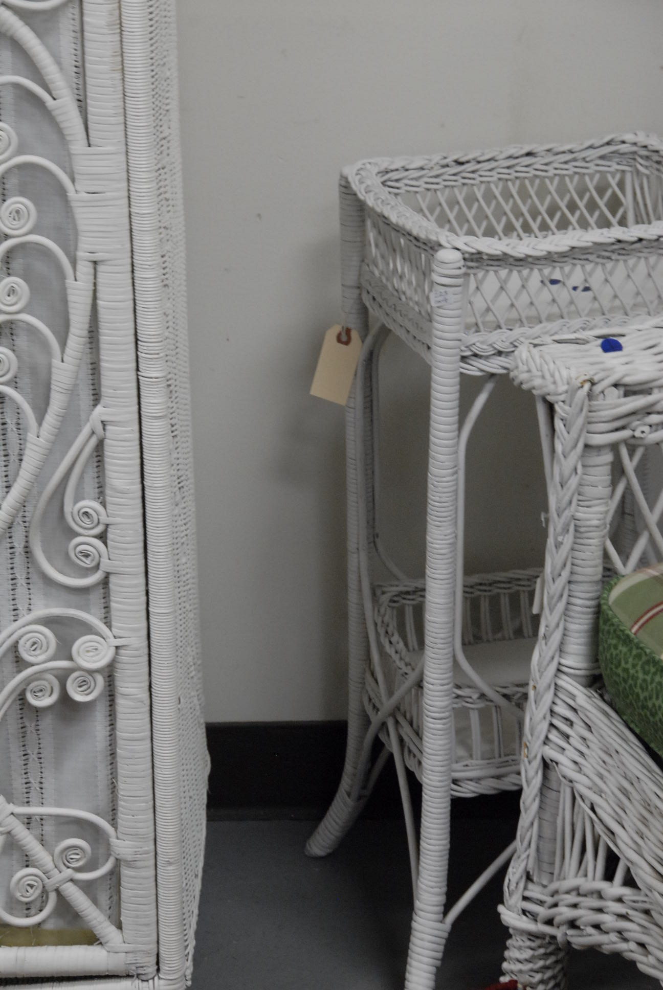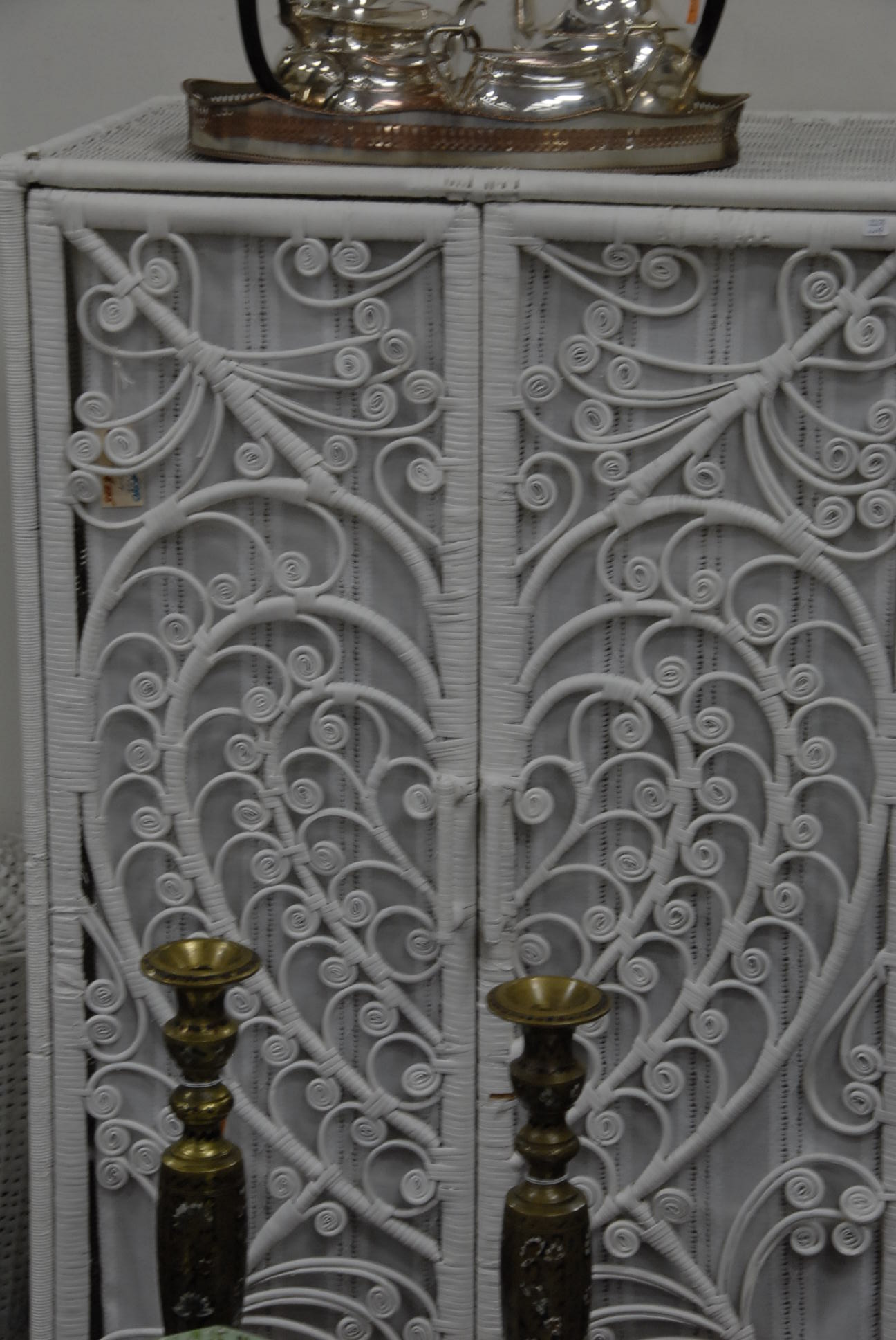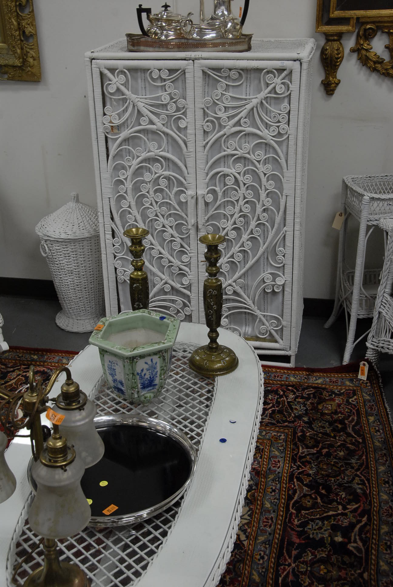 Four piece lot to include a wicker coffee table, a wicker stand, a covered basket and a wicker two door cabinet