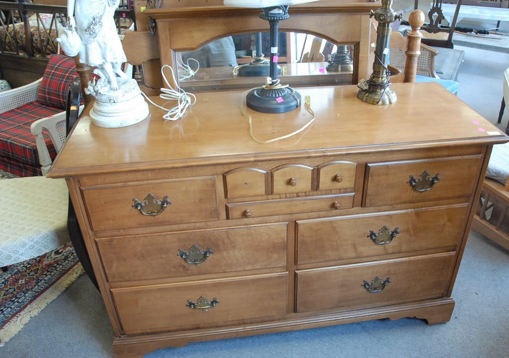 Four piece Rock Maple bedroom set with two chests, double bed, and mirror.