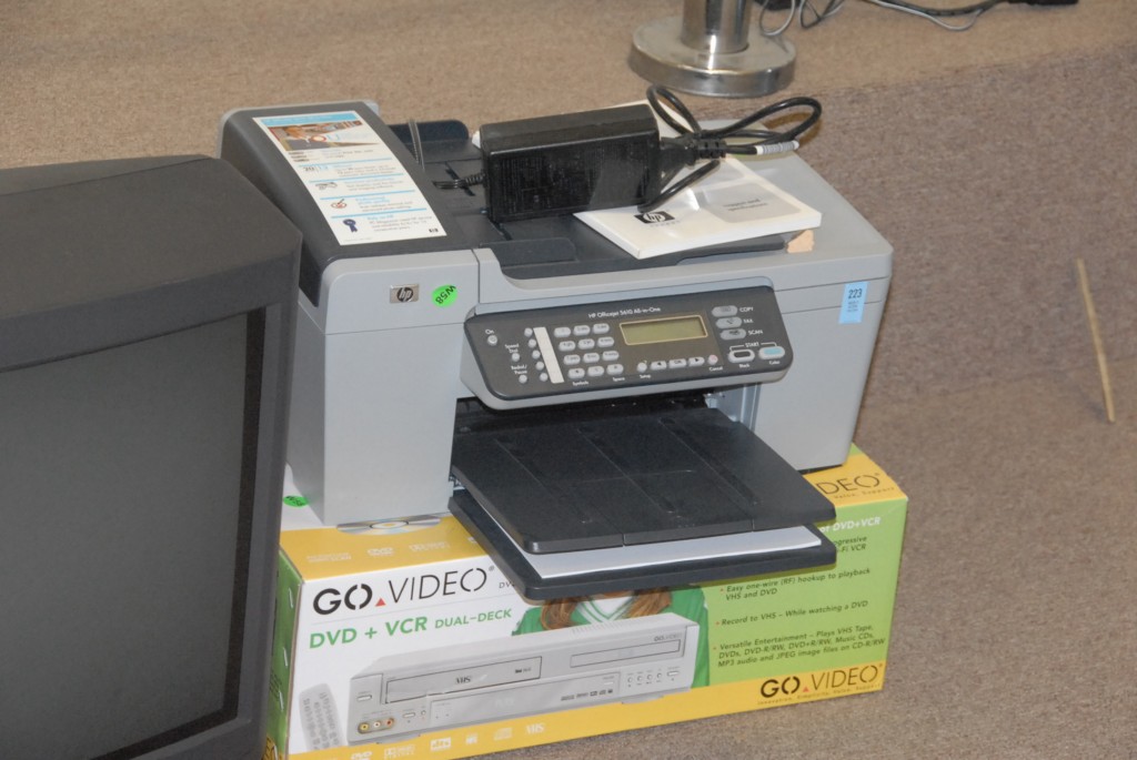 Group lot two portable televisions and HP office jet 5610 all in one printer fax scanner copier along with brand new Go Video DVD/VCR in box.