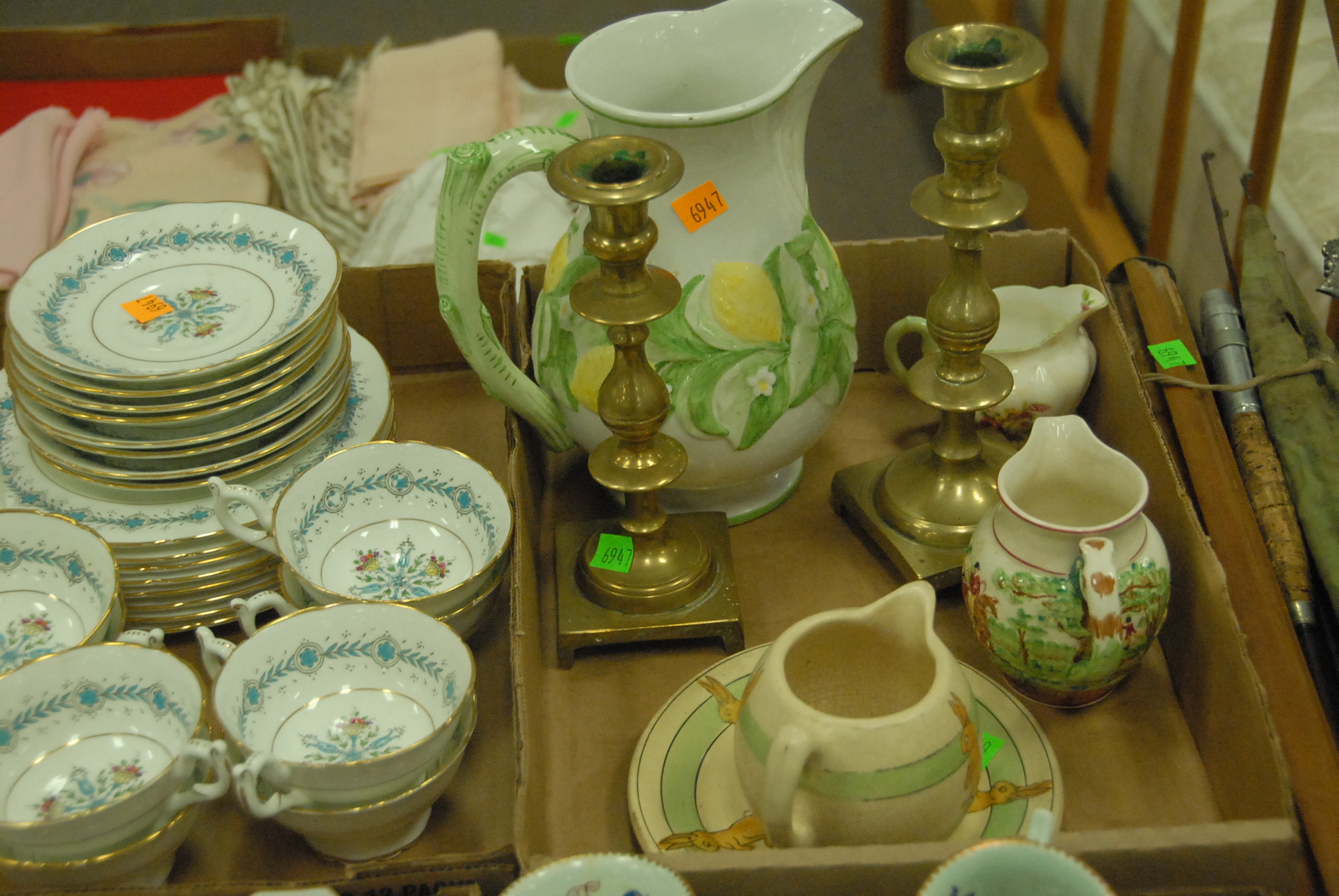Lot 223: Group of four box lots of china, glass, partial china sets, cups, saucers, brass candlesticks, Adam’s partial tea set, and two fishi…