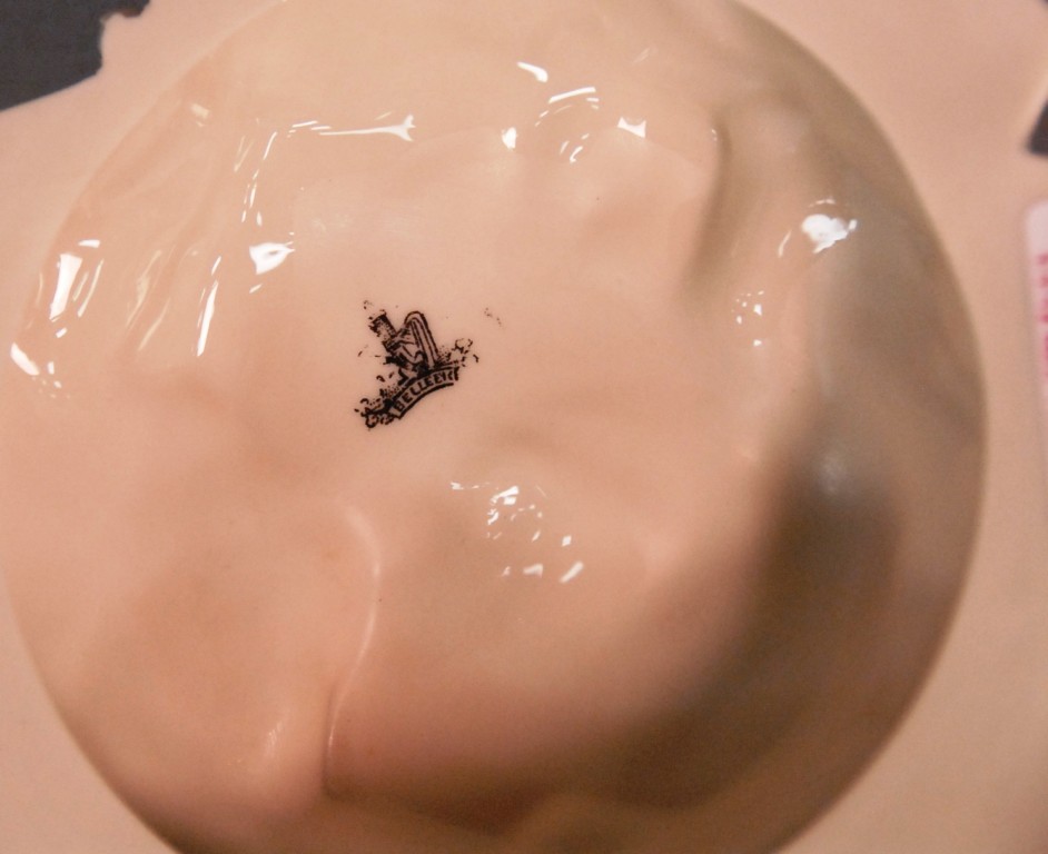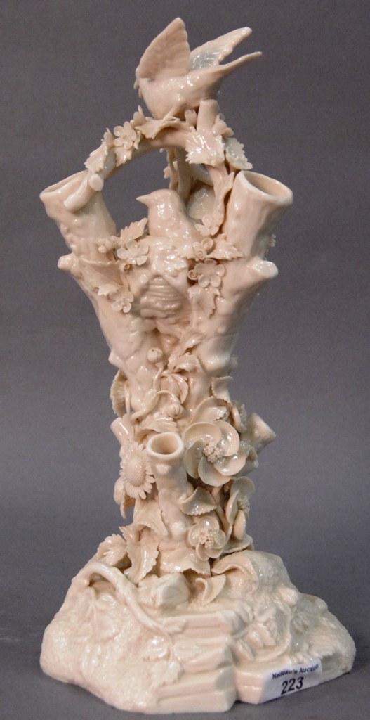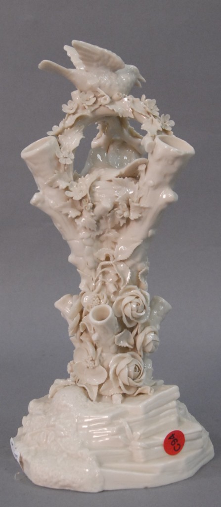 Irish Belleek tree trunk vase mounted with birds and flowers, black mark. height 12 1/2in.
