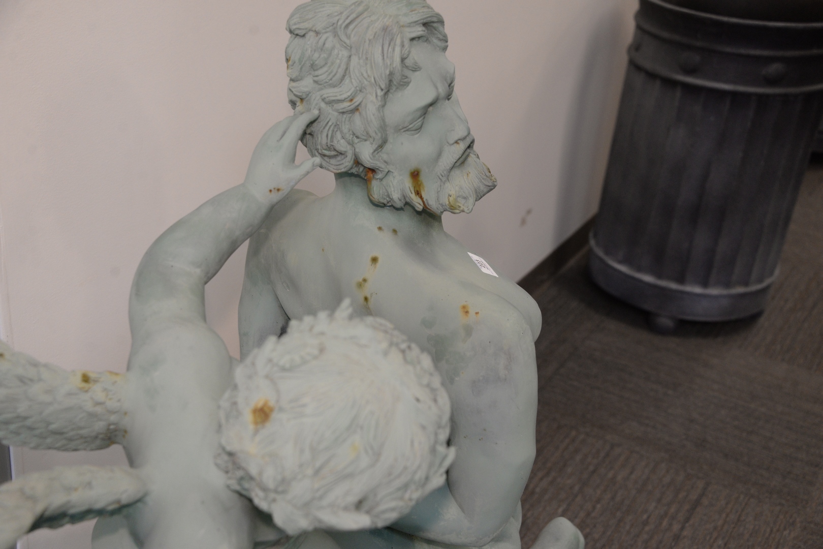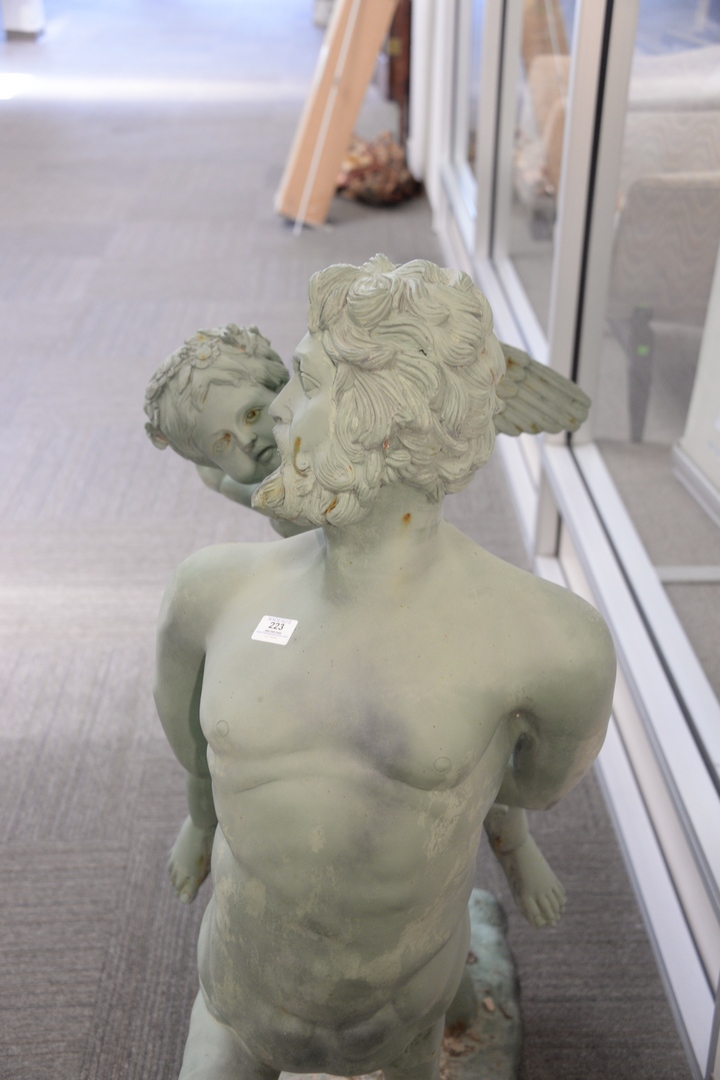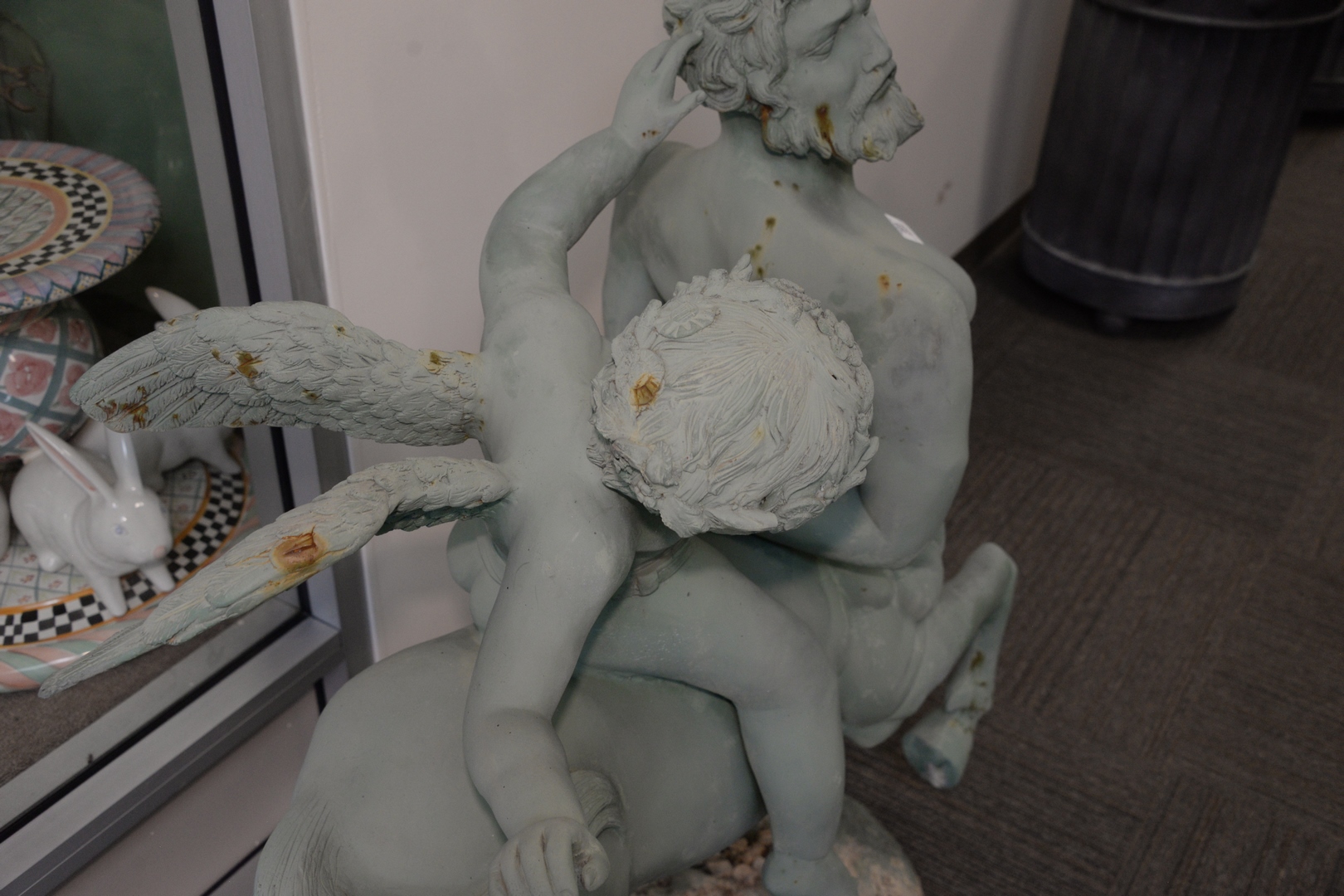 Lot 223: Large Outdoor Metal Figural Sculpture, having a putti riding a centaur, height 49 inches, width 40 inches, depth 15 inches.