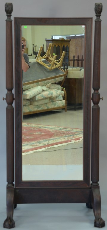 Lot 223: Mahogany Chippendale style cheval mirror with ball and claw feet. ht. 73in., wd. 35in.