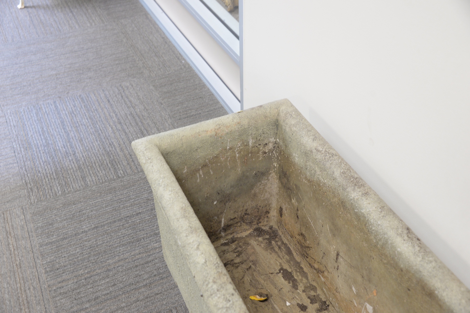 Oversized Rectangle Cast Cement Outdoor Planter, height 18 inches, length 60 inches, depth 18 inches.