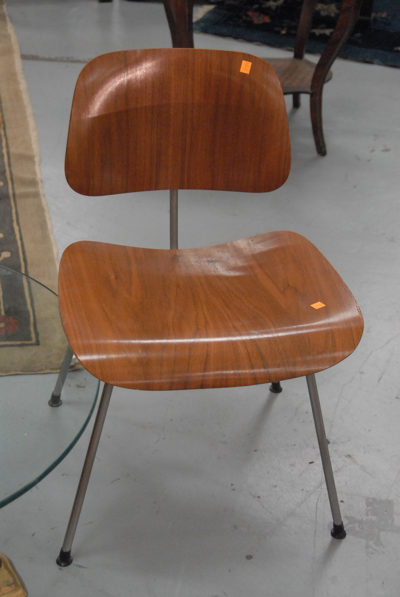 Pair of Charles and Ray Eames DCM chairs good condition, have been refinished and one has stain and paint mark ht. 29in. wd. 21in. dia. 12 1/2in.