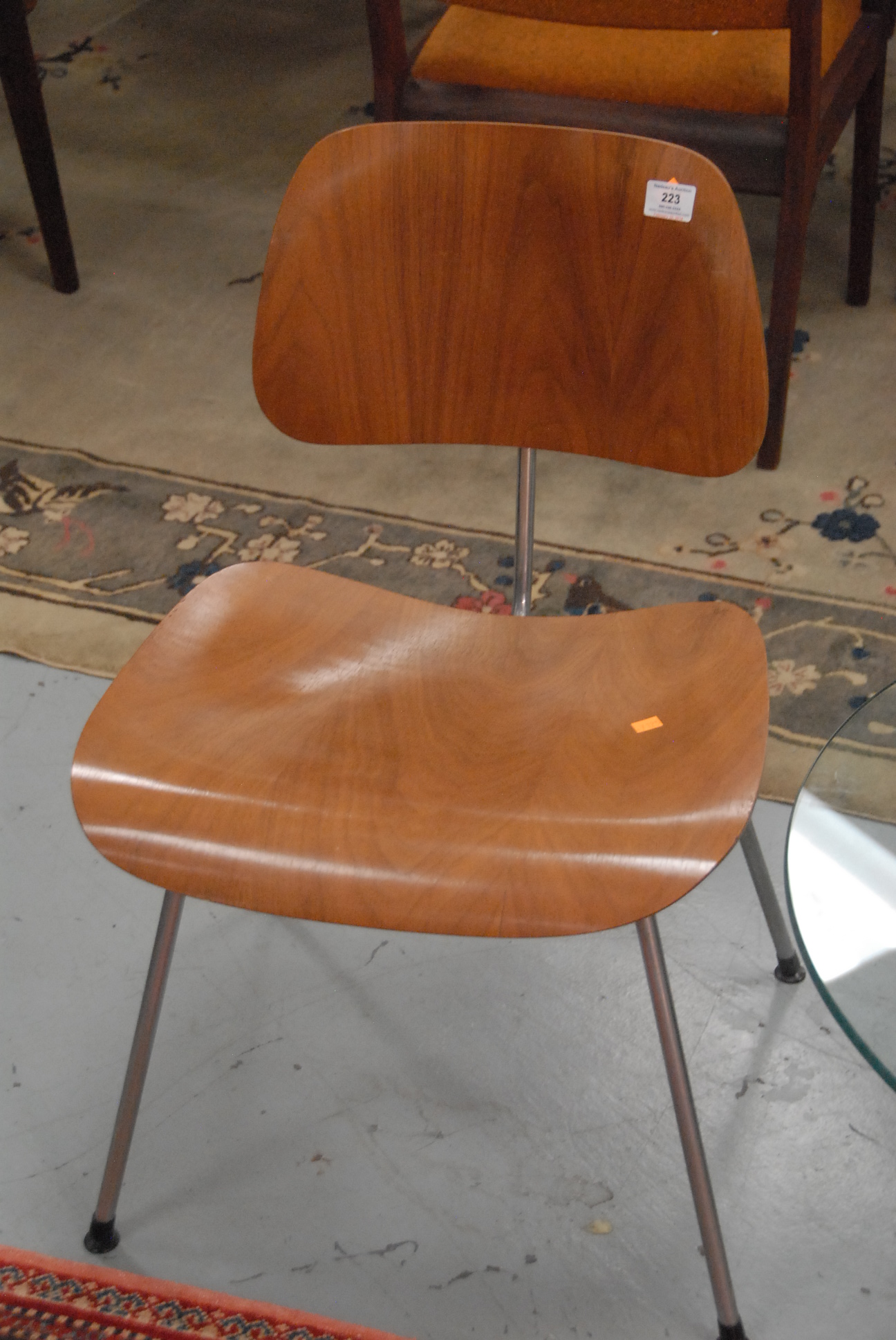 Lot 223: Pair of Charles and Ray Eames DCM chairs good condition, have been refinished and one has stain and paint mark ht. 29in. wd. 21in…