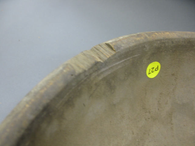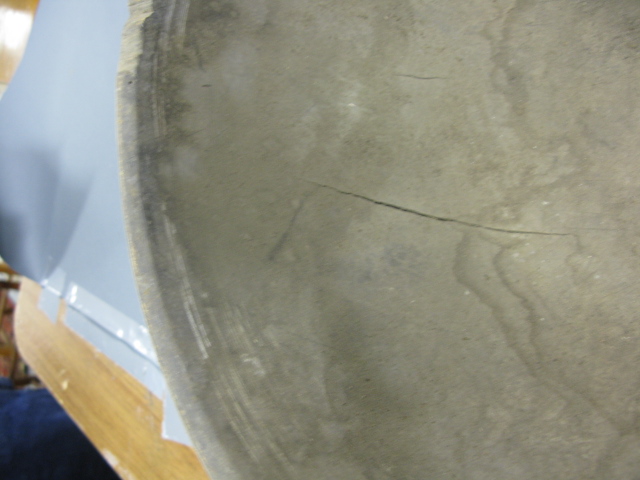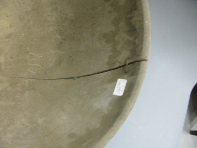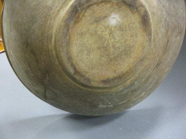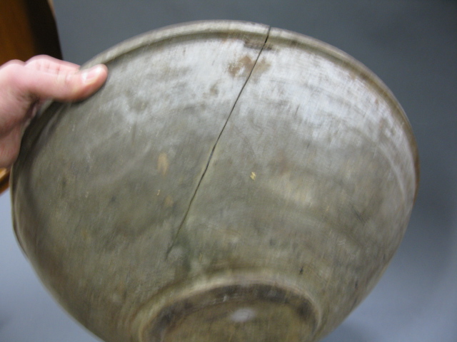 Primitive turned wooden bowl with original grey paint crack on one side.