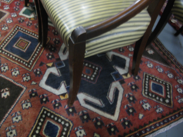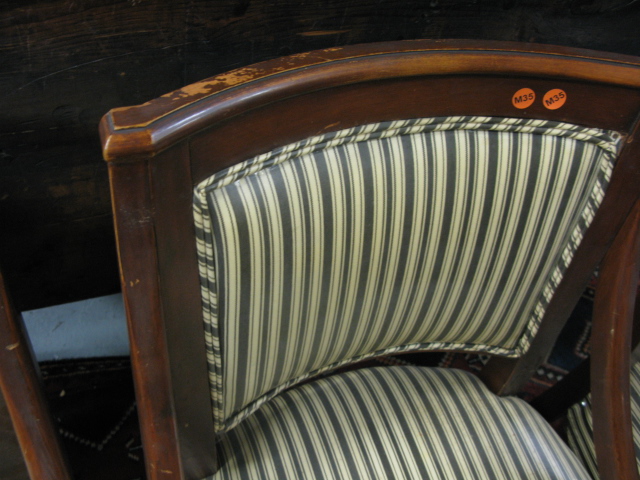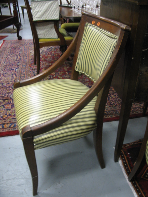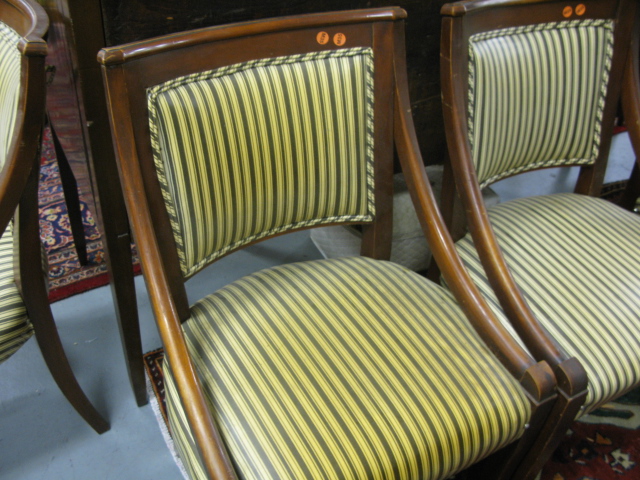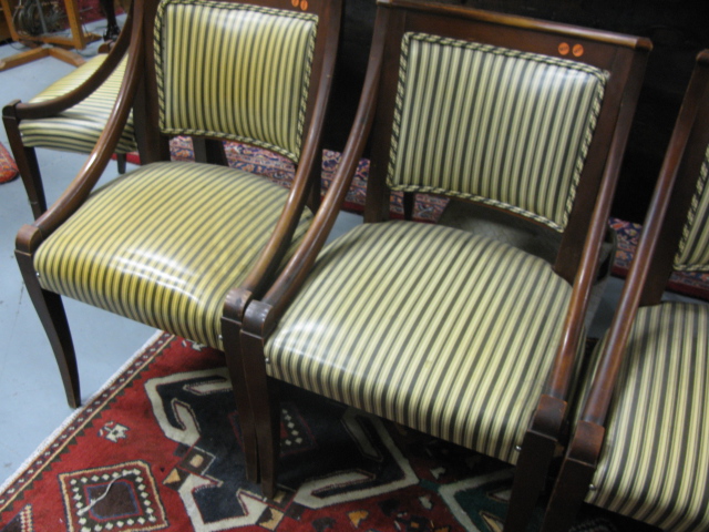 Set of six dining chairs with vinyl upholstered seats and backs.