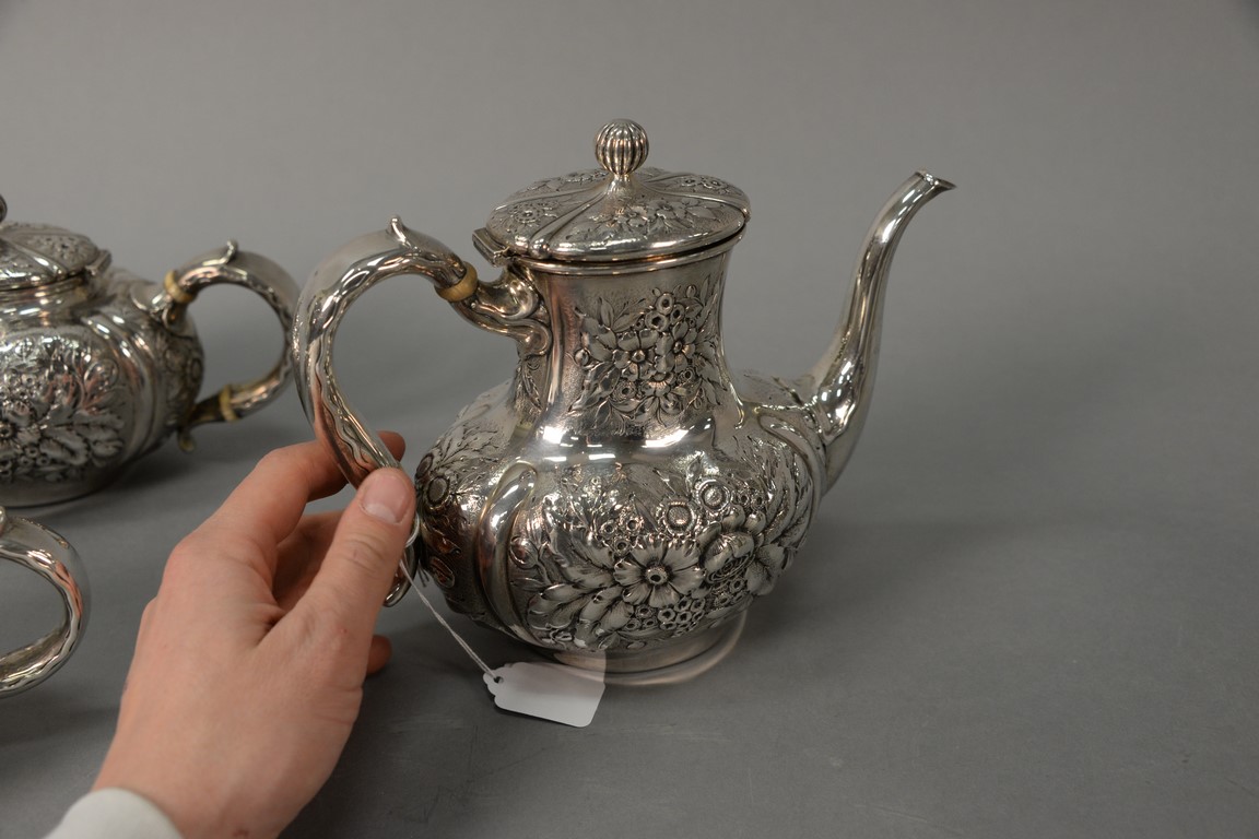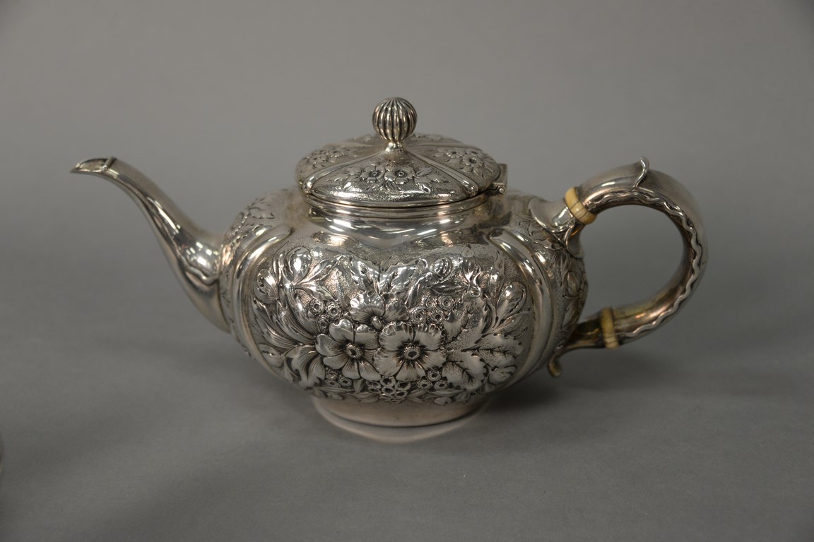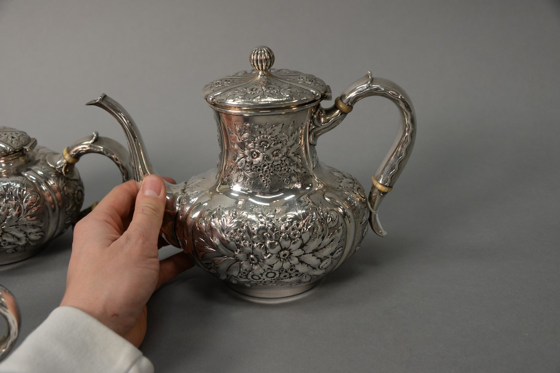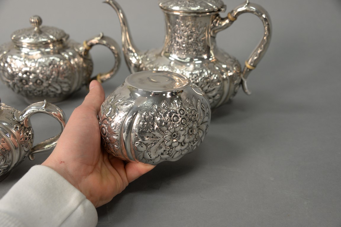 Lot 223: Sterling silver five piece tea and coffee set having repousse tops and bodies. largest: height 8 inches 68.8 troy ounces