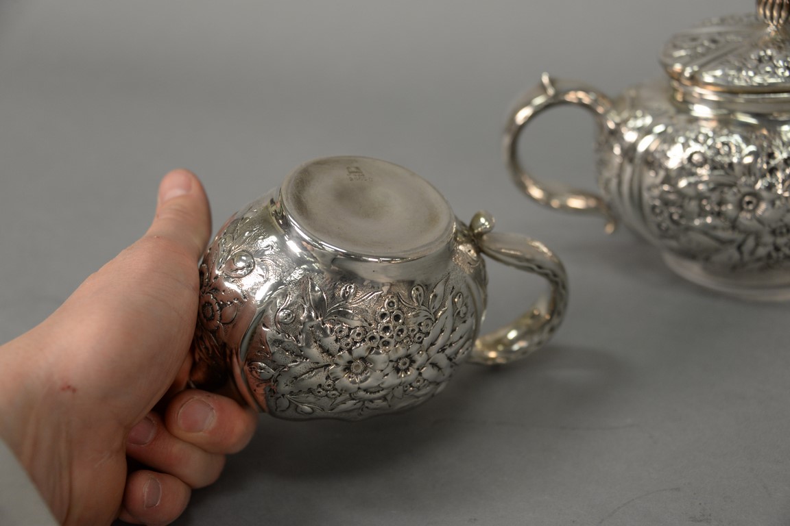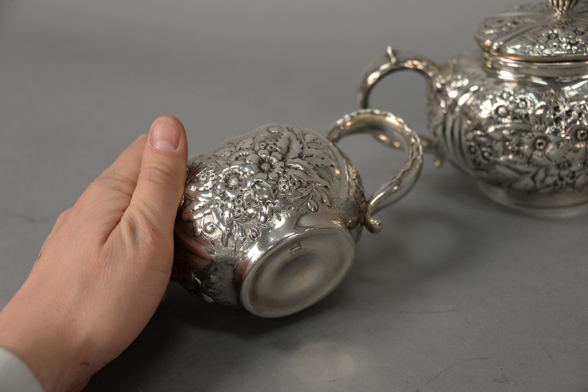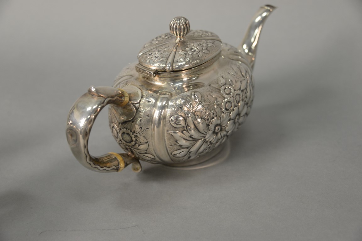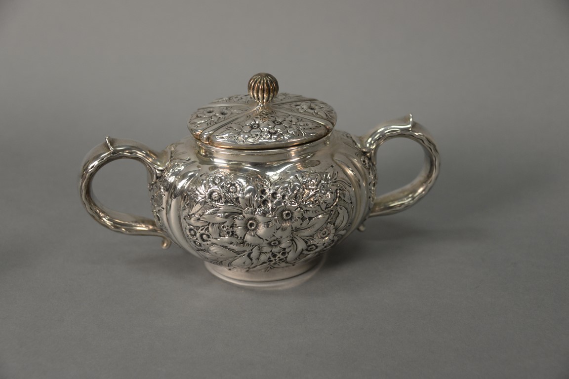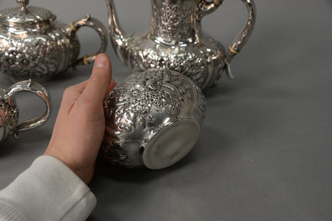 Lot 223: Sterling silver five piece tea and coffee set having repousse tops and bodies. largest: height 8 inches 68.8 troy ounces