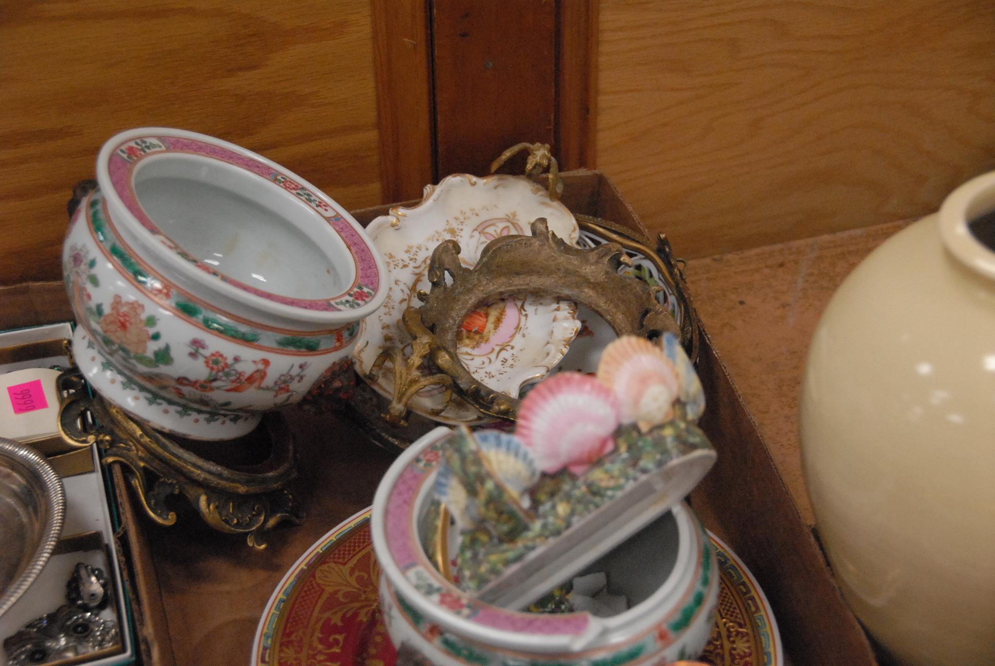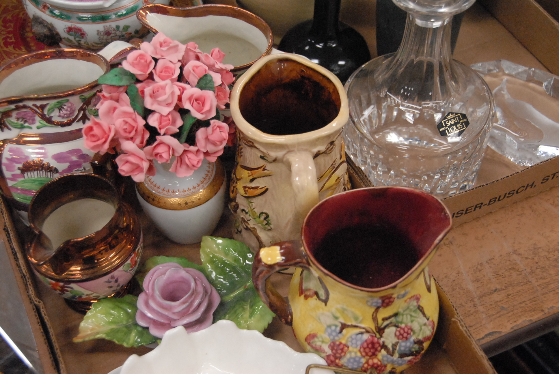 Three box lots to include vases, copper luster pots, and Oriental vase with metal base.