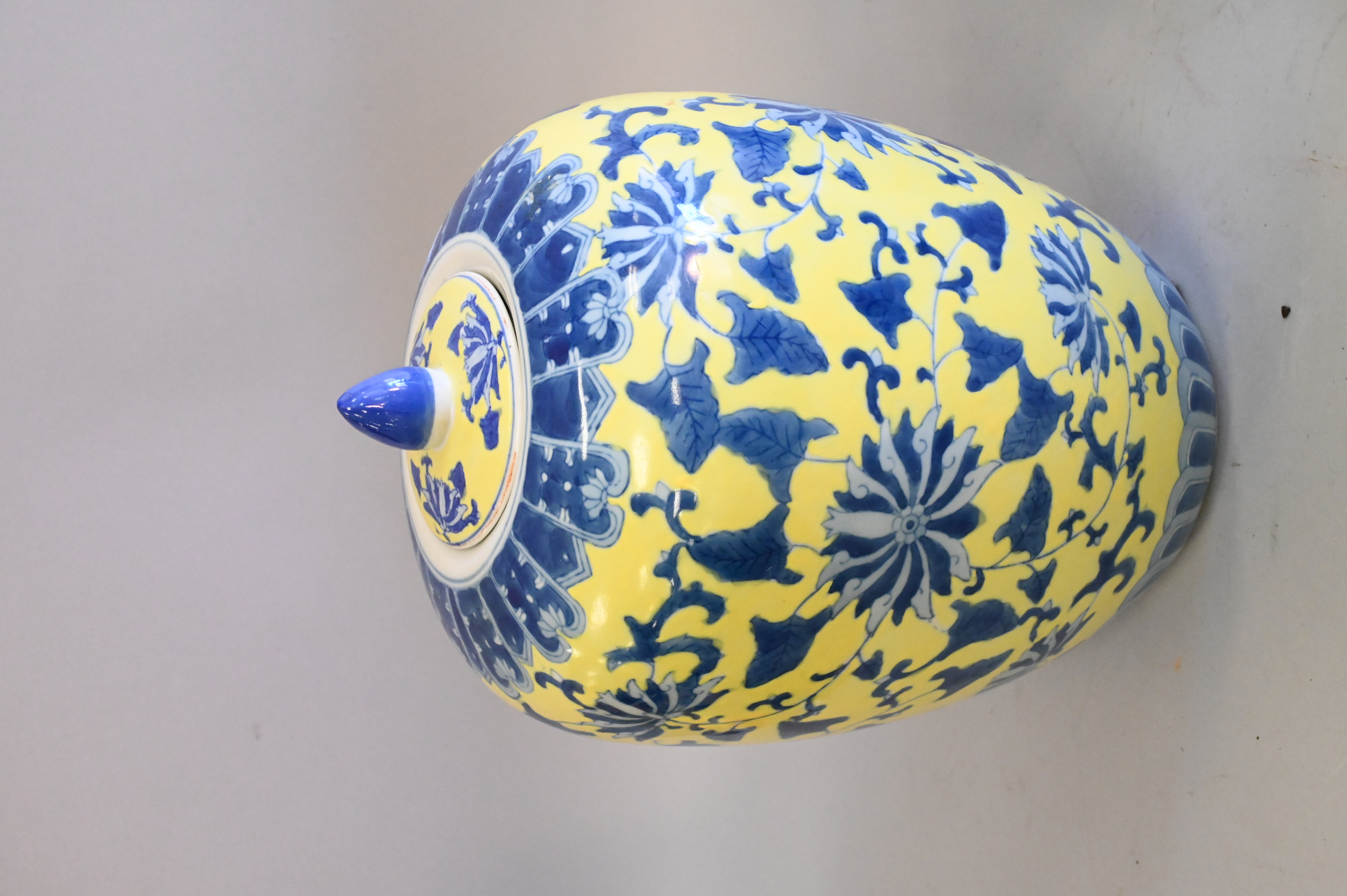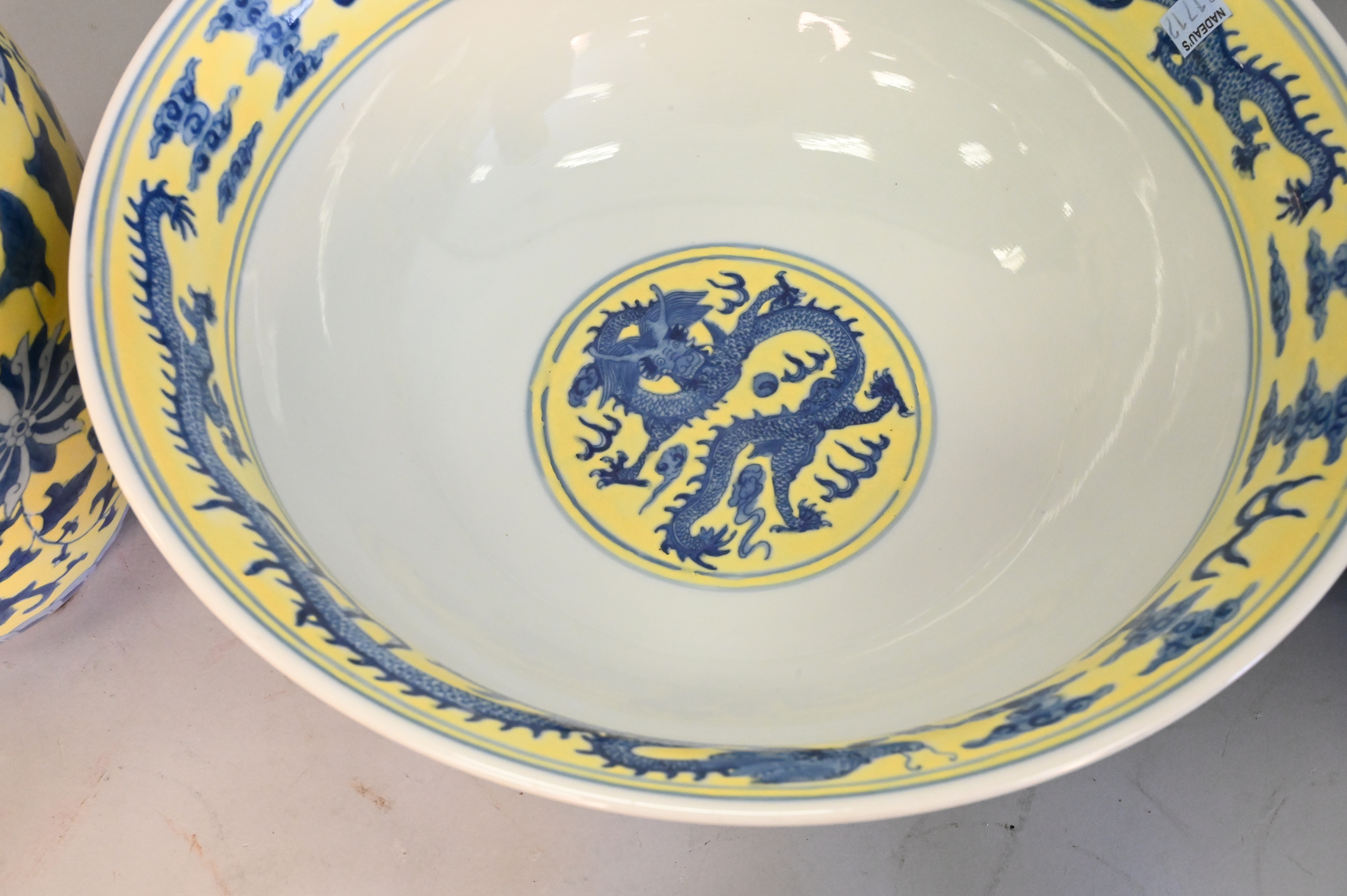 Three Piece Chinese Porcelain Group, pair of ginger jars (height 12 inches), and a large center bowl having yellow group with blue painted flowers, dragons (height 7 inches, diameter 14 1/2 inches)