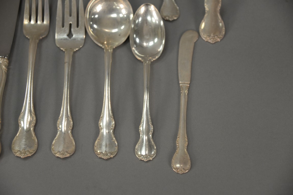 Lot 223: Towle French Provincial sterling silver flatware to include 1 dinner fork, 8 luncheon forks, 8 salad forks, 9 teaspoons, 9 soup spoons, 7 butter knives, 10 dinner knives, and 6 serving pieces. 56.8 t oz. plus handles.