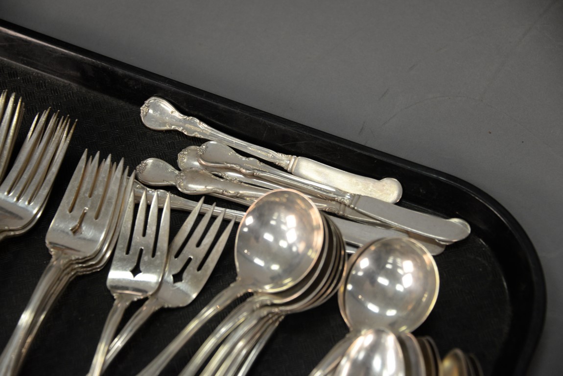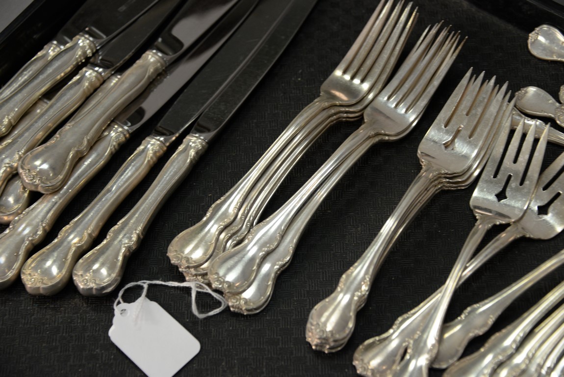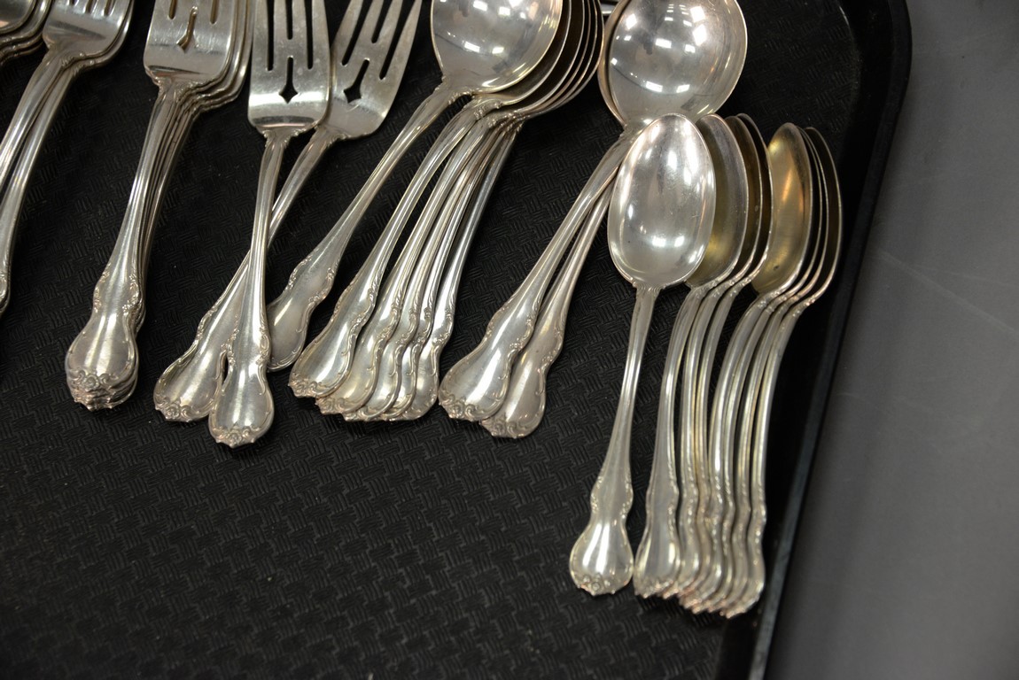 Towle French Provincial sterling silver flatware to include 1 dinner fork, 8 luncheon forks, 8 salad forks, 9 teaspoons, 9 soup spoons, 7 butter knives, 10 dinner knives, and 6 serving pieces. 56.8 t oz. plus handles.