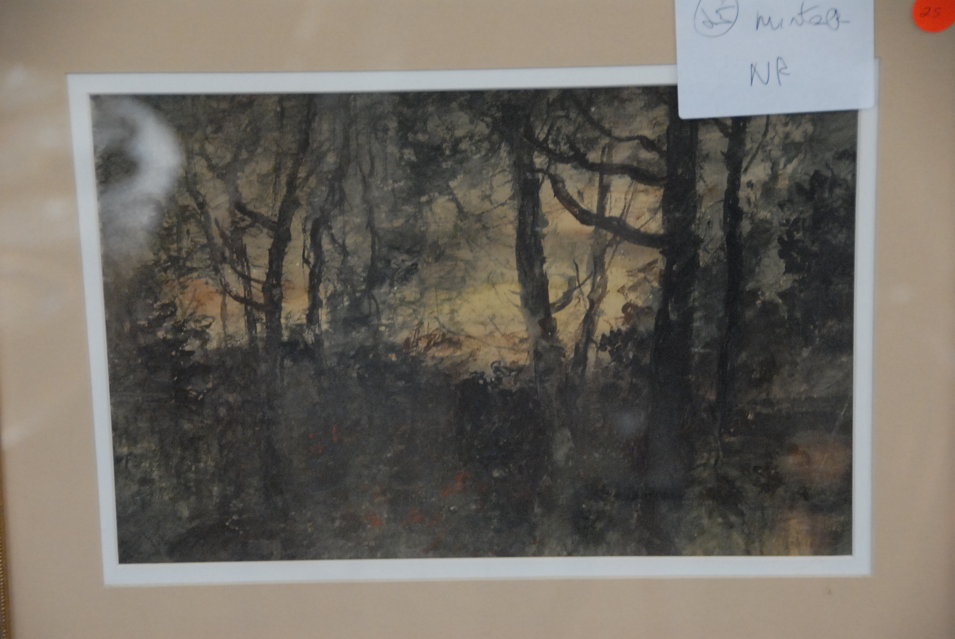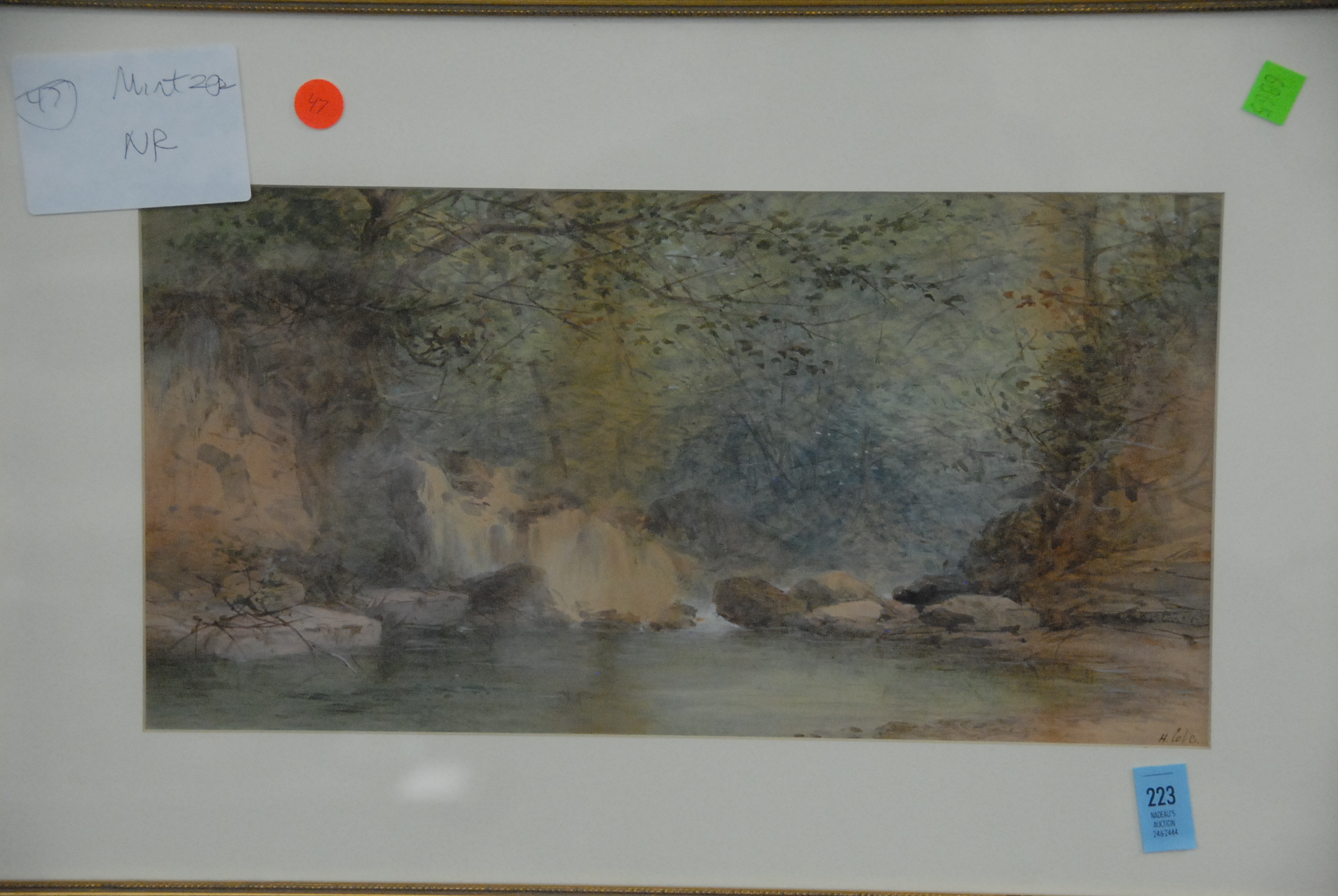 Lot 223: Two framed watercolors, one wooded landscape with stream signed lower right H. Cole and the other wooded landscape unsigned.