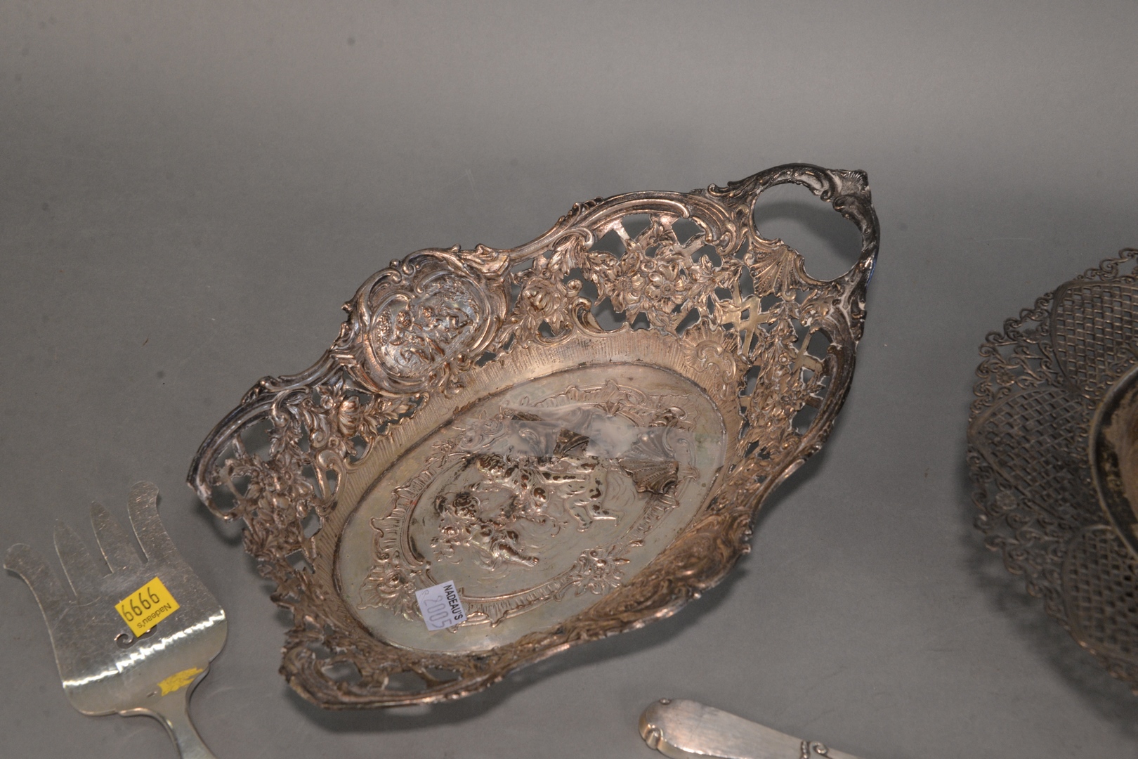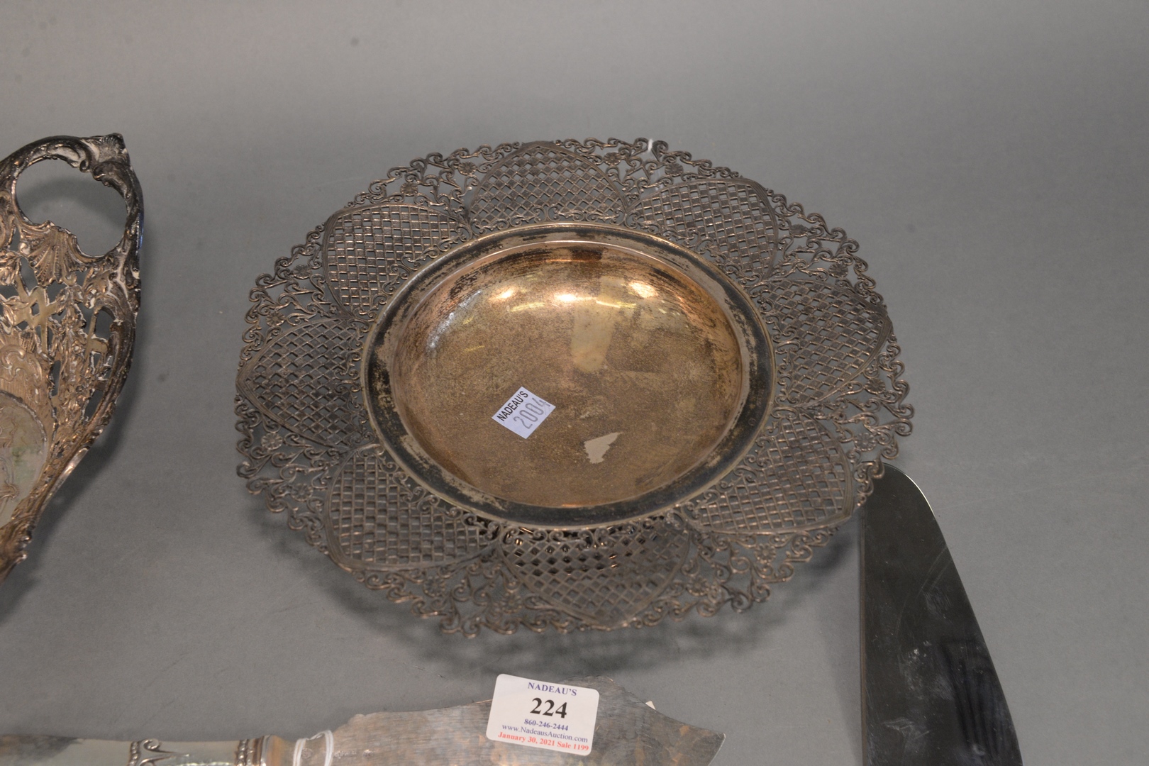 Lot 224: Adler Sterling Silver Compote along with a Continental silver plate dish as is two Heimburger serving pieces and four sterling ha…