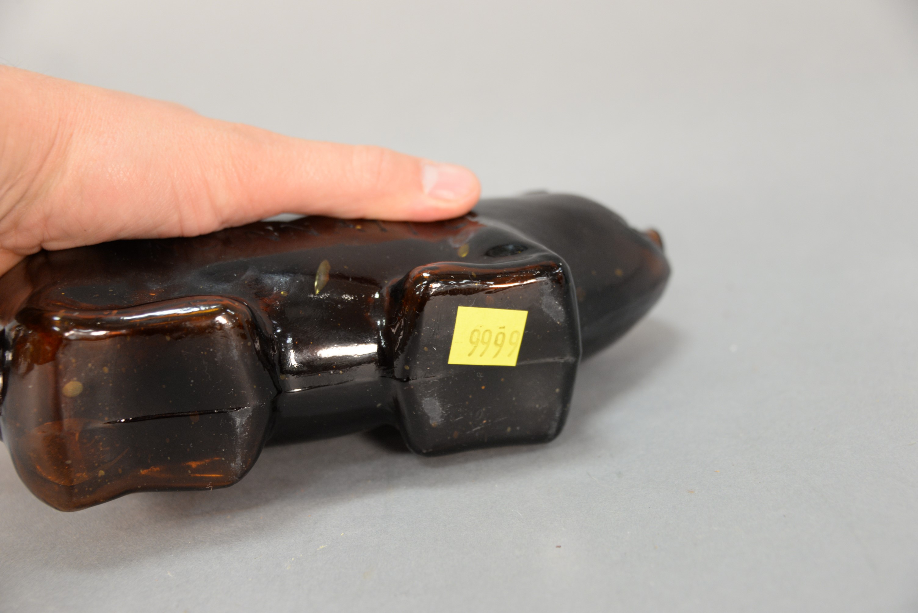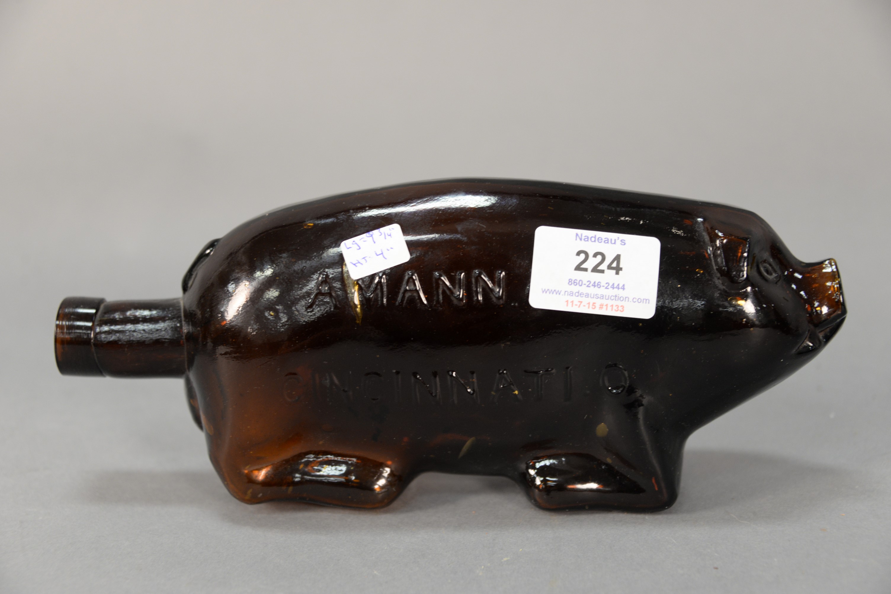 Lot 224: Berkshire Bitters deep amber pig bottle by Amann and Co., Cincinnati O, excellent condition. ht. 4 in. lg. 9 3/4 in.