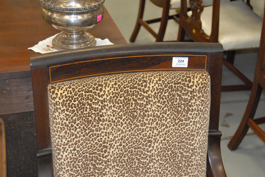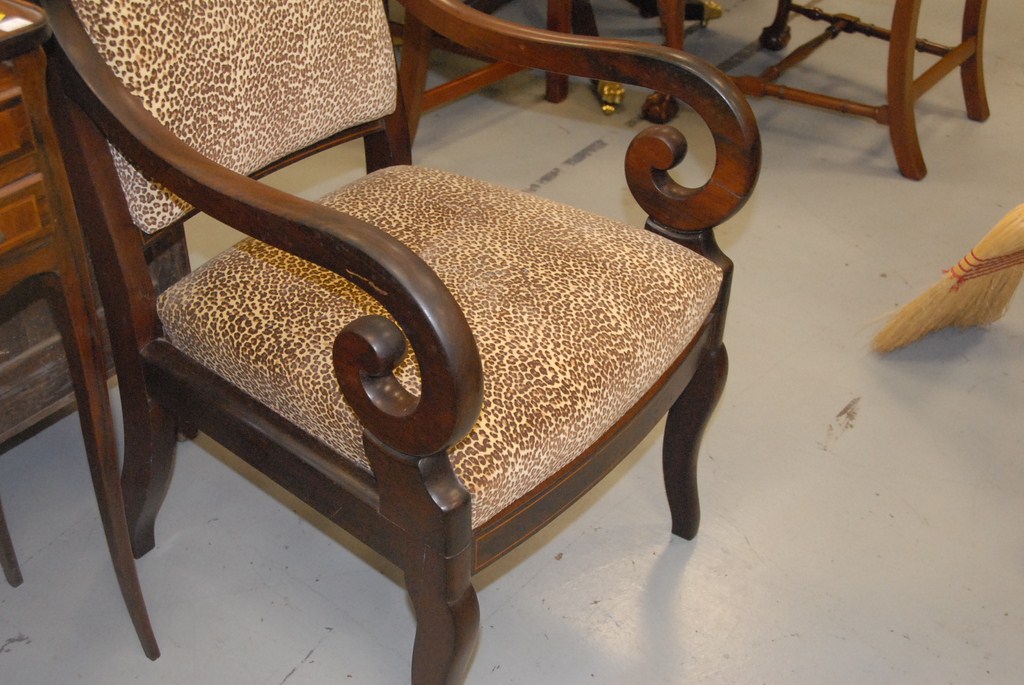 Lot 224: Classical mahogany federal armchair probably Boston with serpentine crest rail above a canted back resting on molded saber legs, ear…