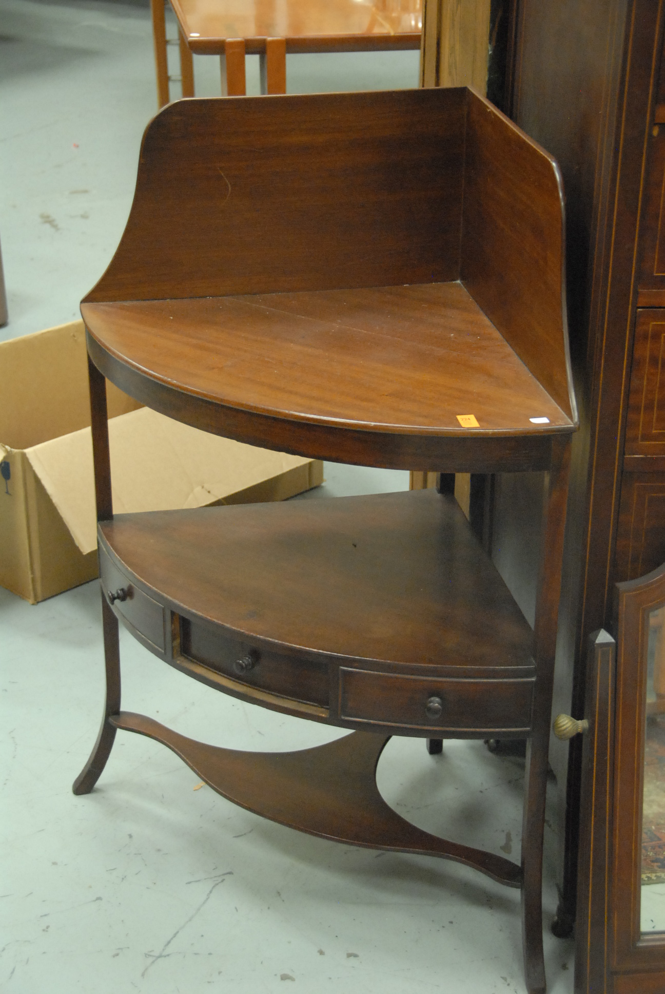 Lot 224: Federal mahogany corner stand with drawer, circa 1800.