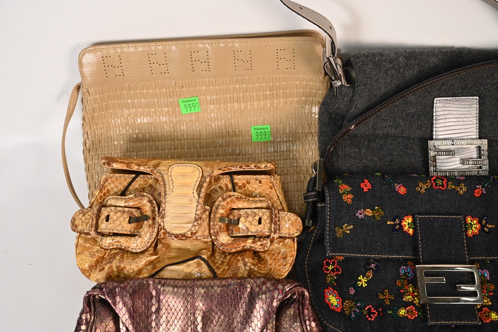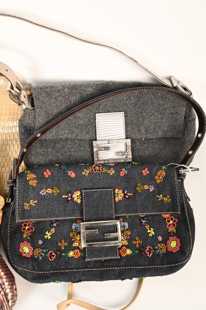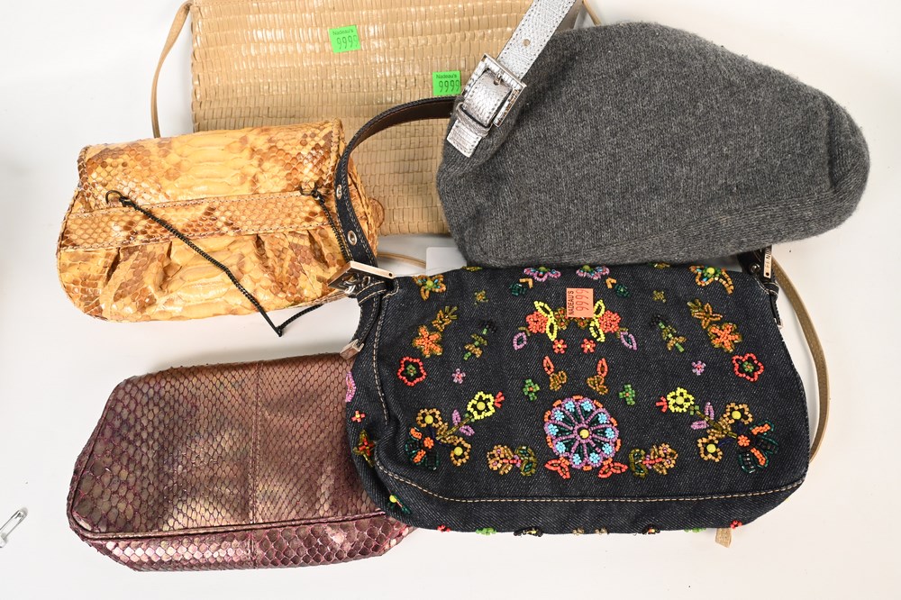 Five Piece Lot of Fendi Handbags, to include small gold snake skin, iridescent snake clutch, blue denim with applied beaded accents, grey knit with rhinestone buckle and woven tan, all having normal wear.