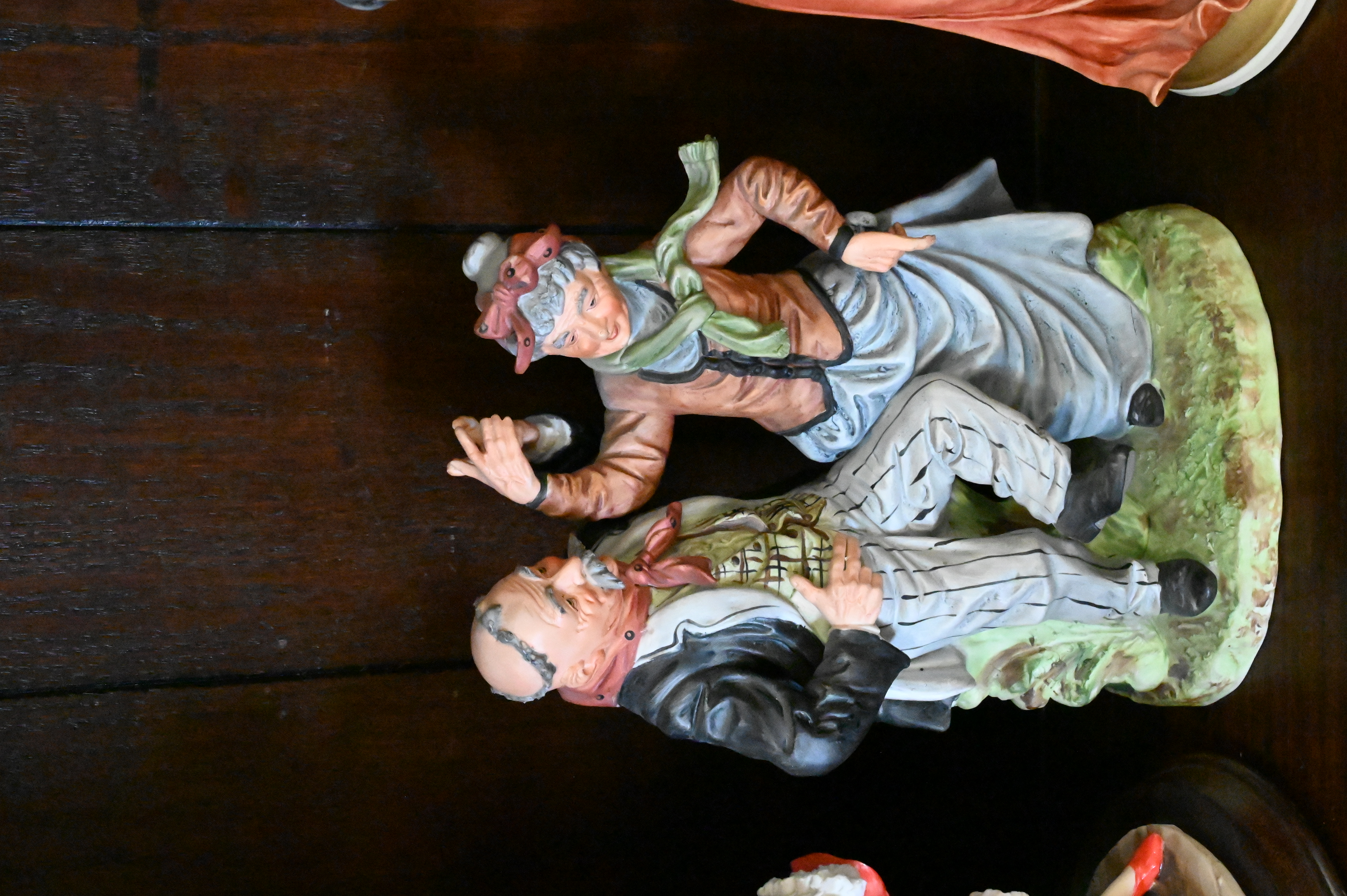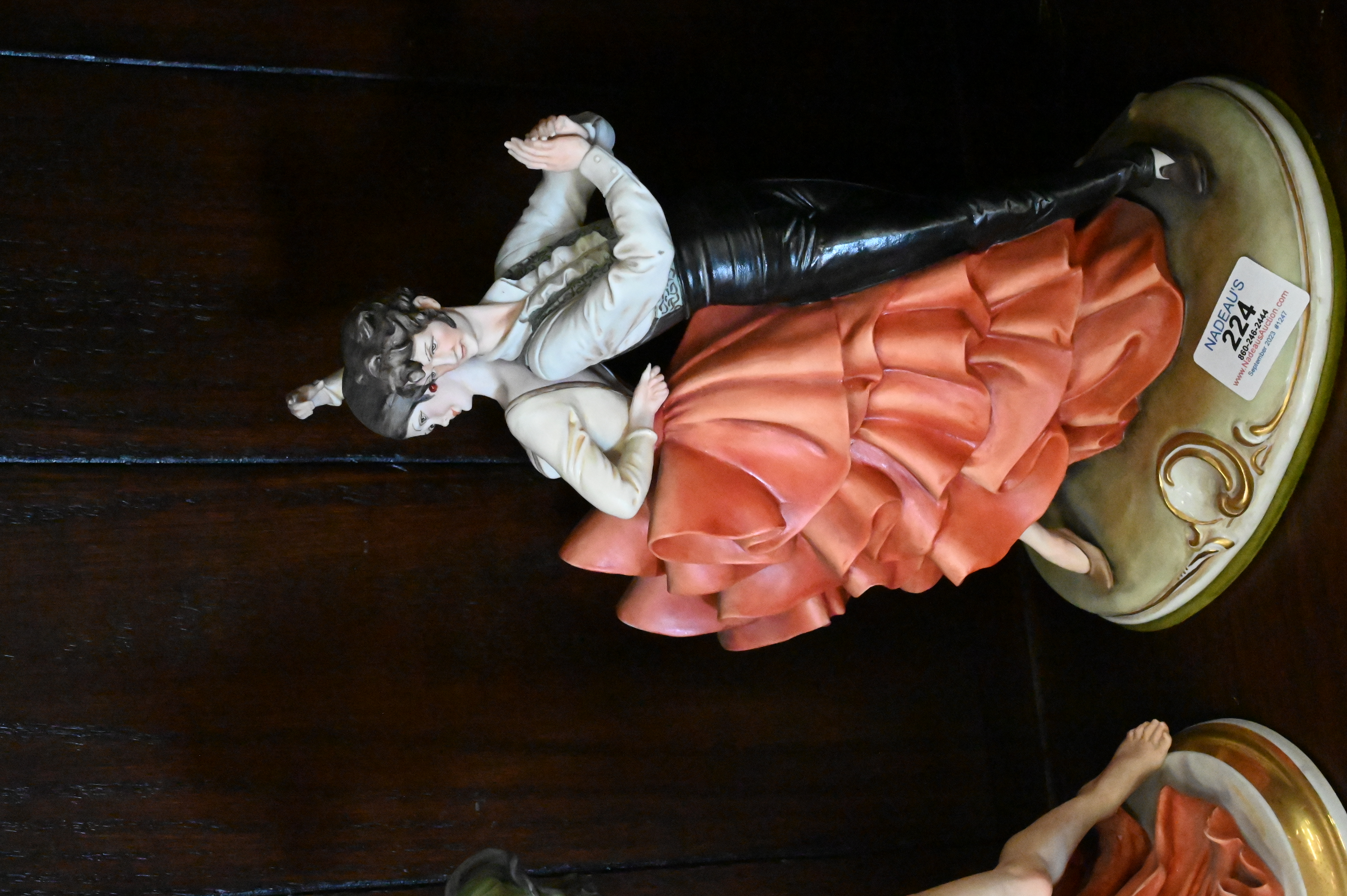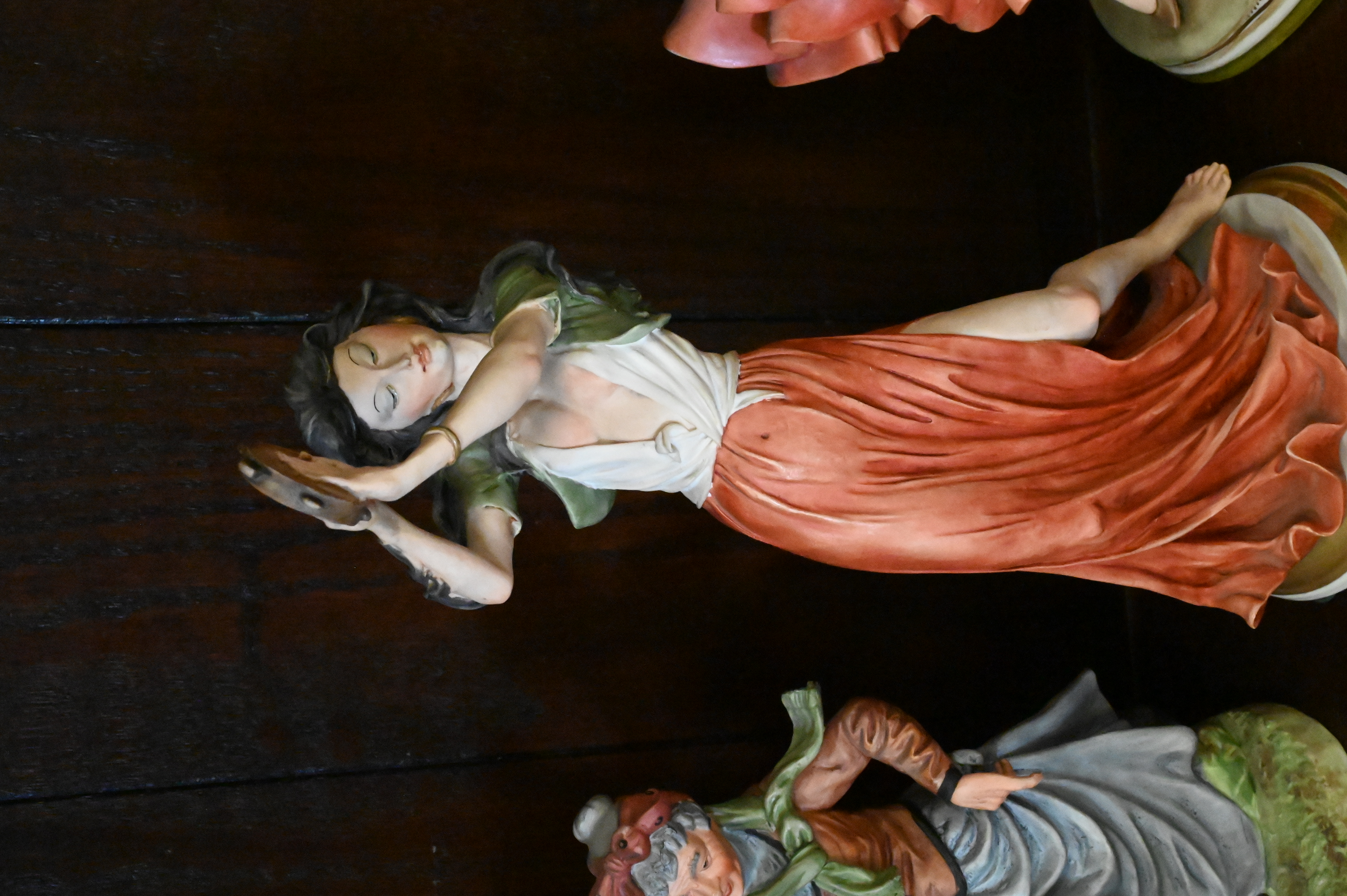 Four Capodimonte Style Porcelain/Ceramic Figures, to include Esmerelda Gypsy figure, marked with “N and crown”, Spanish dancers, marked with “N and crown” signed B. Merli, “Pucci” flamenco dancer, dancing elderly couple, tallest height 14 inches.