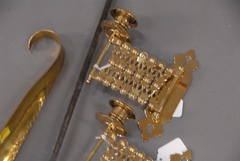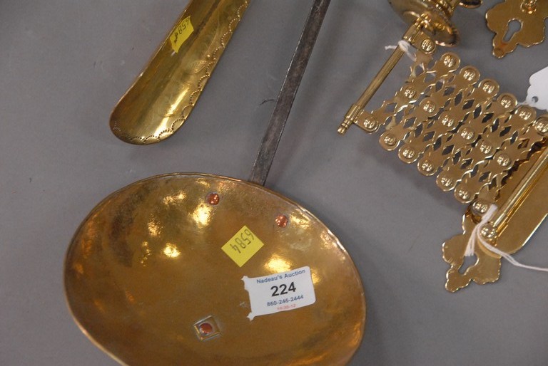 Four piece brass lot large ladle, shoe horn, and pair of accordion candle holders.