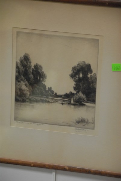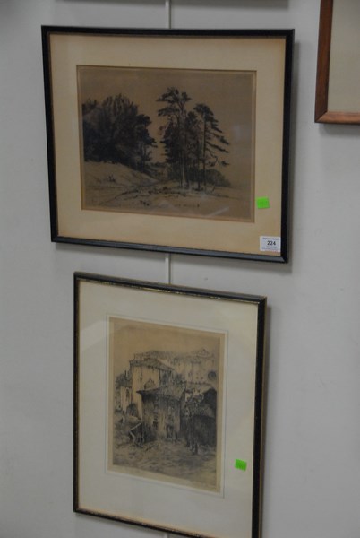 Group of four etchings and a print including Thiola D’Aocenzo etching Old Church Burzoa signed lower right Thiola D’Aocenzo, Charles Forget 1886-1960 etching of French castle pencil signed lower right Ch Forget, John Gullaford etching The Shames of Shepportion, Etching of house initialed lower left L.G. 9 1/4 x 12 1/4, and one print.