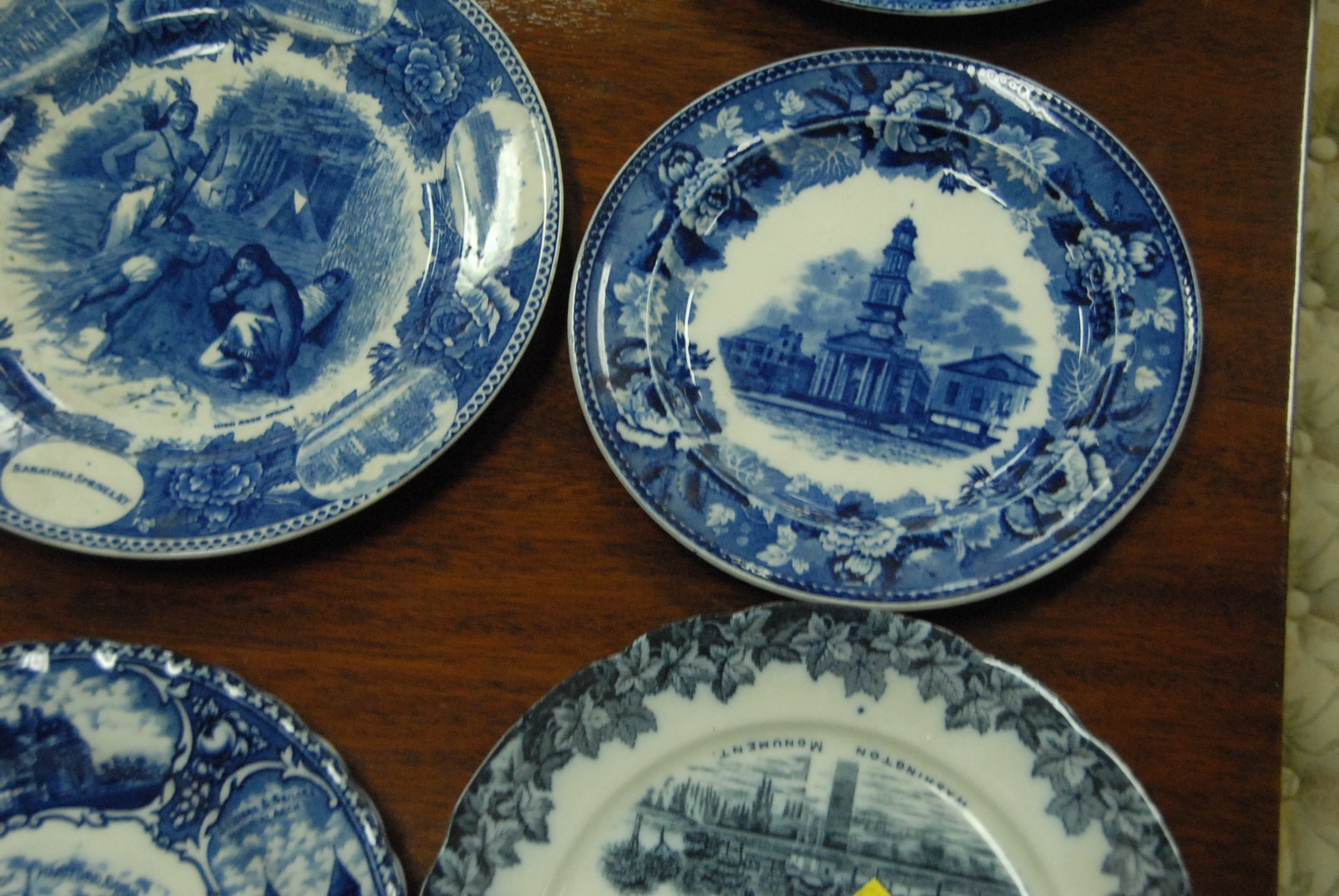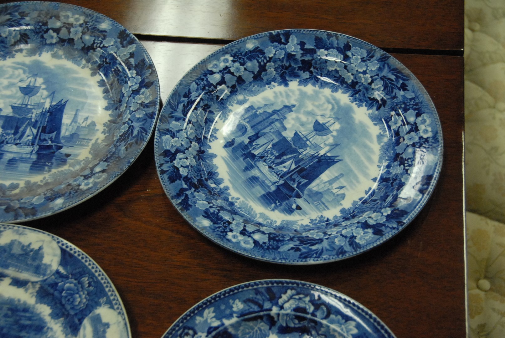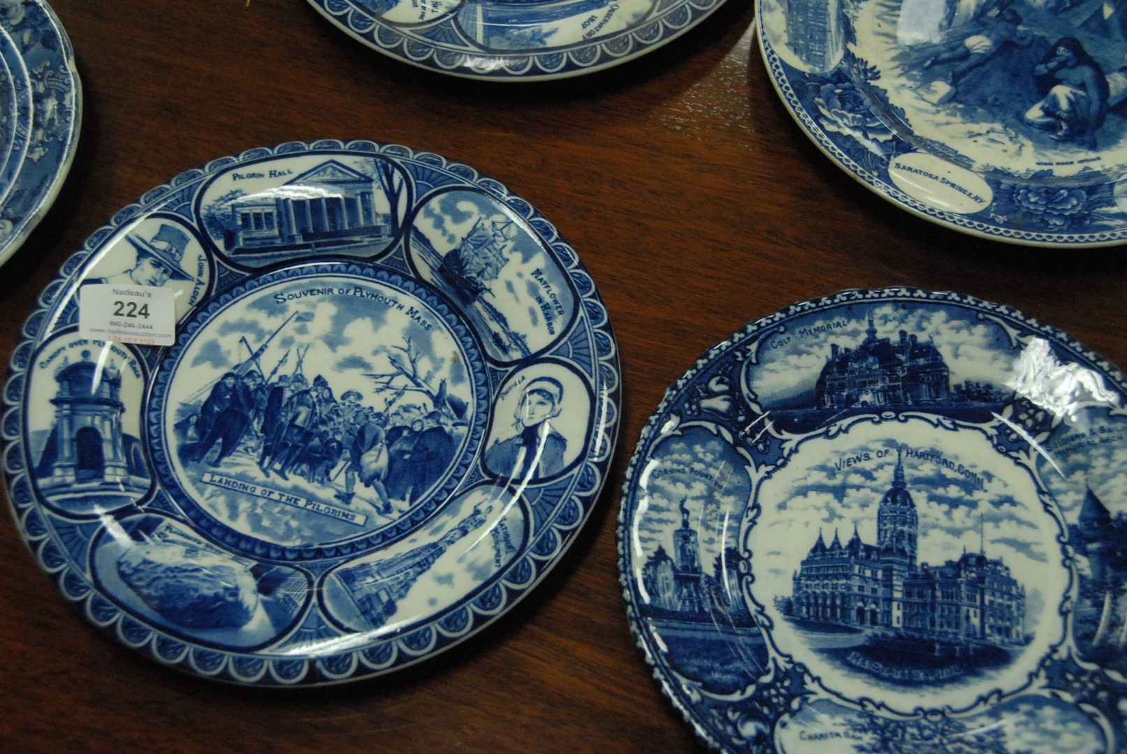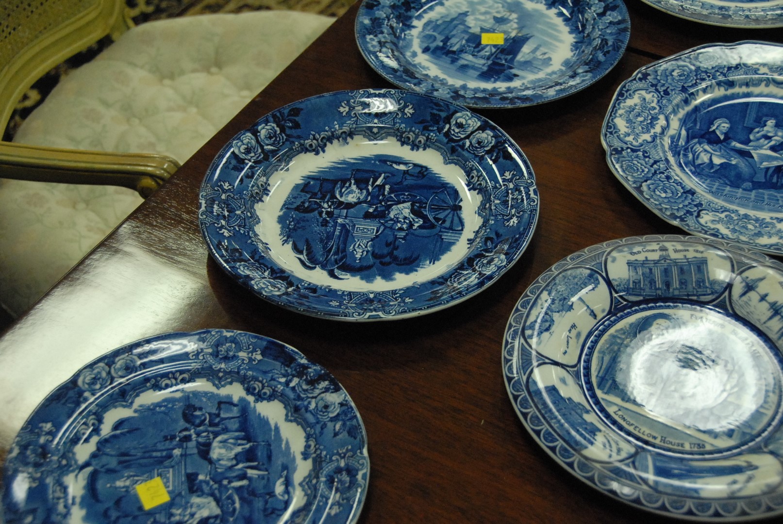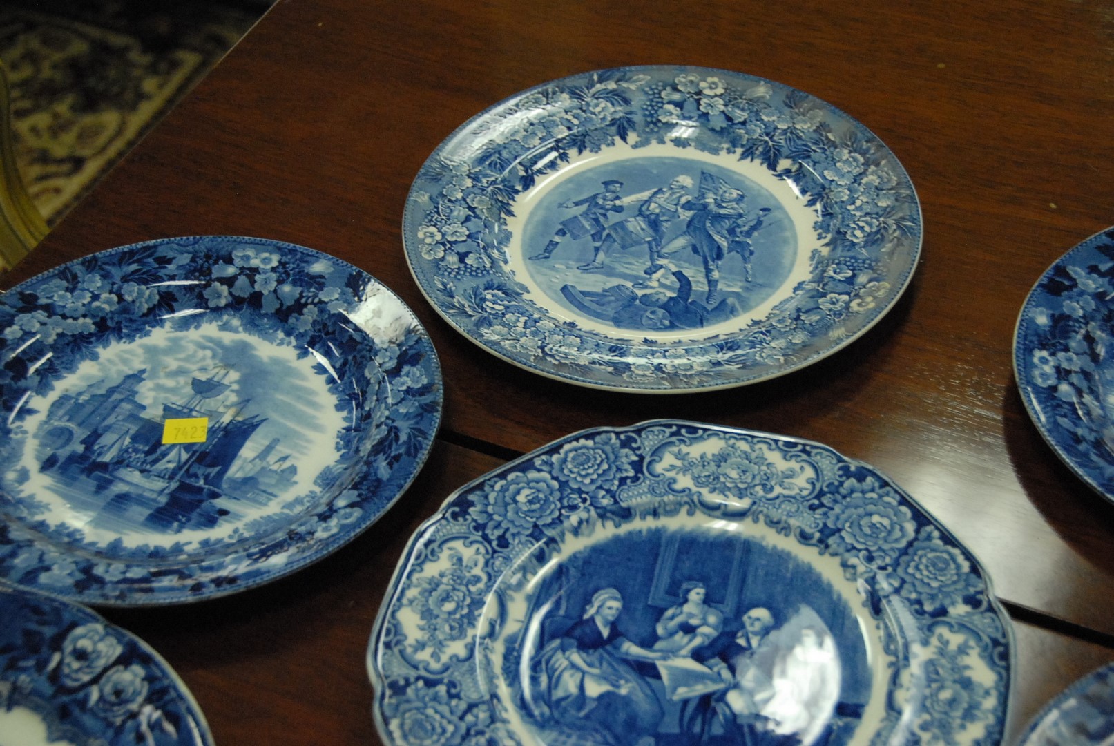Lot 224: Group of fourteen blue and white plates to include Wedgwood, Etruria, Spanish Festivities, souvenir plates, and set of four Ferrara…