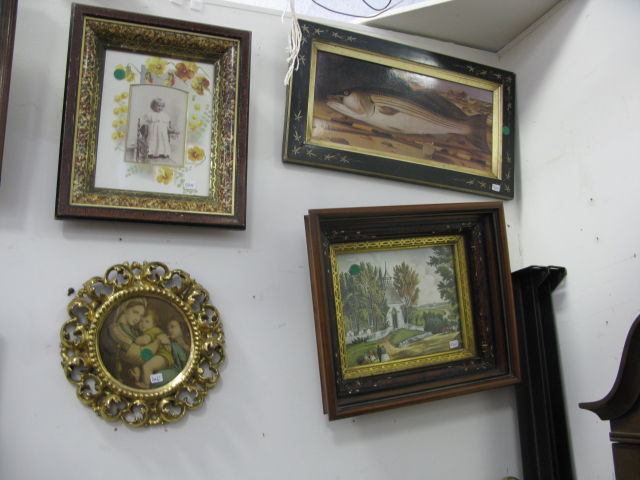 Group of ten Victorian frames, some with prints, one with Wallace Nutting print.