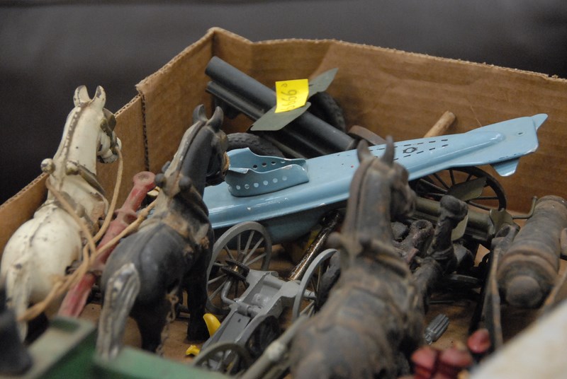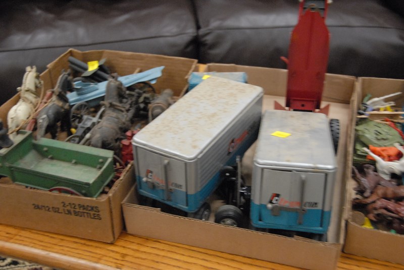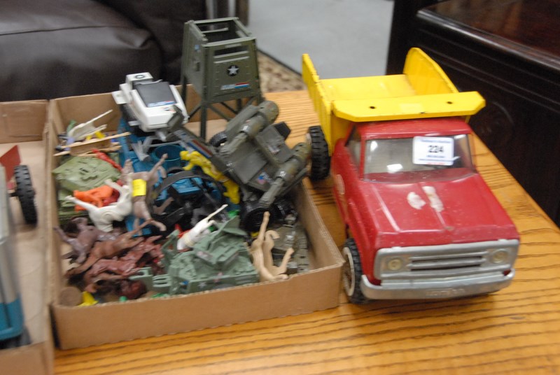 Group of toys to include Tonka, GI Joe, iron horses, and carriages.