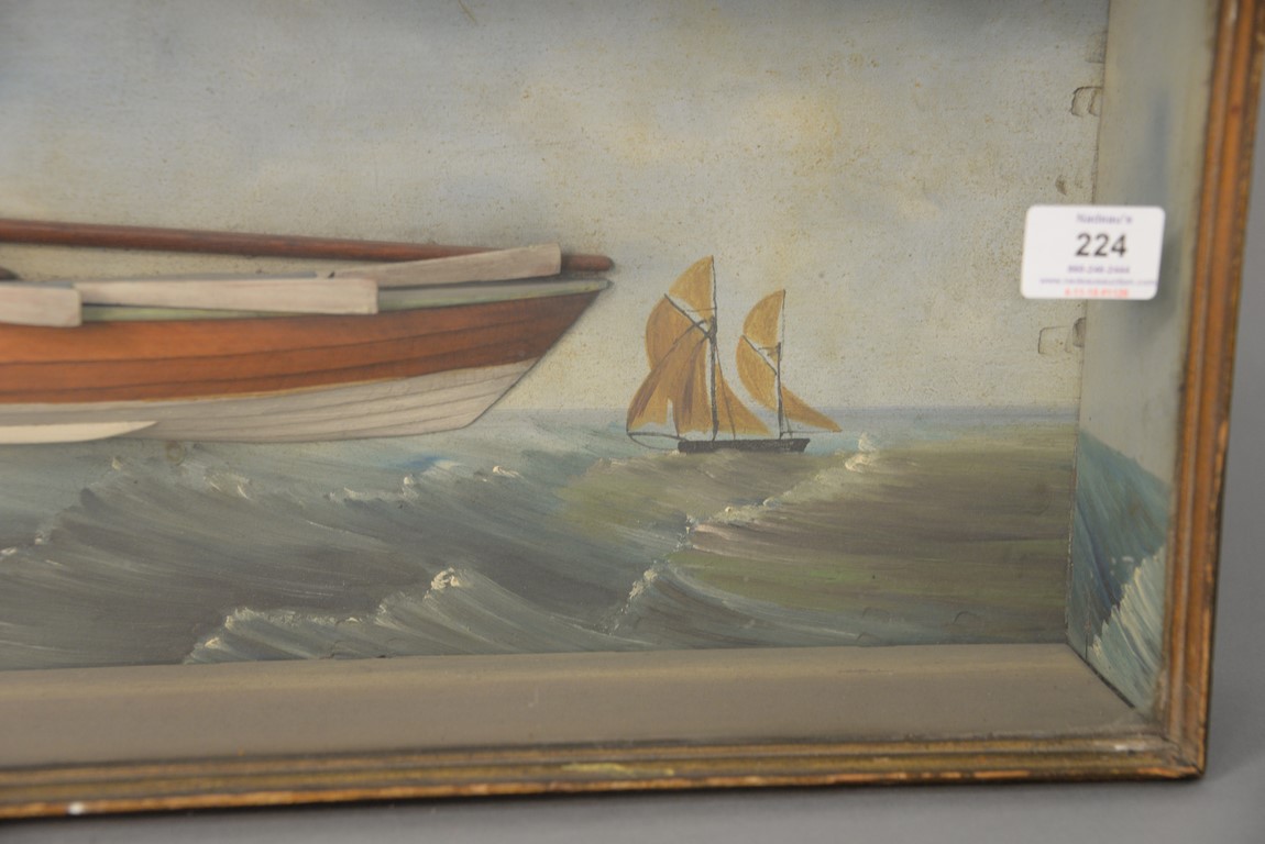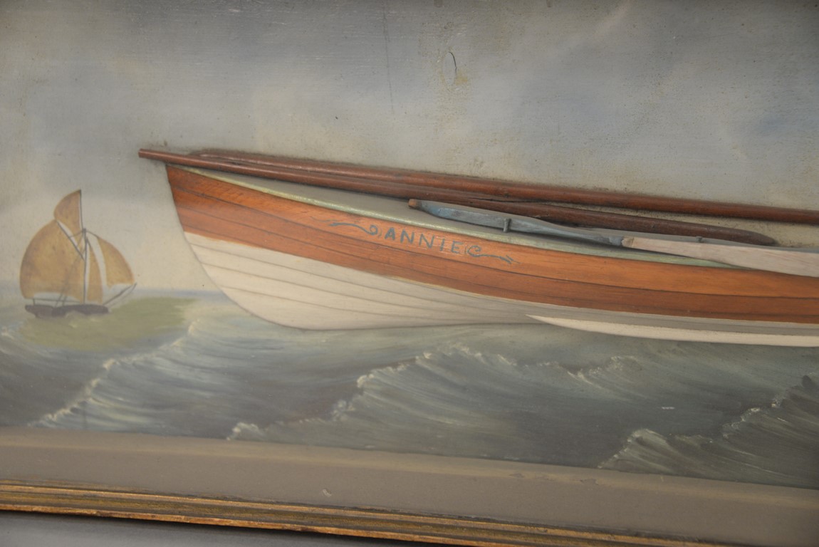 Lot 224: Half hull in diorama case, small sailboat Annie with two paddles. total ht. 11 in. total lg. 31 1/2 in.