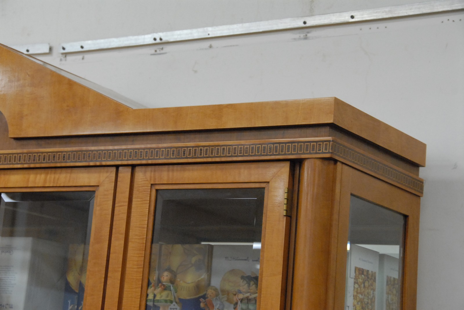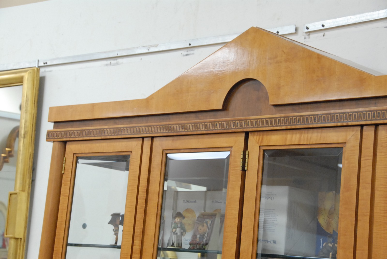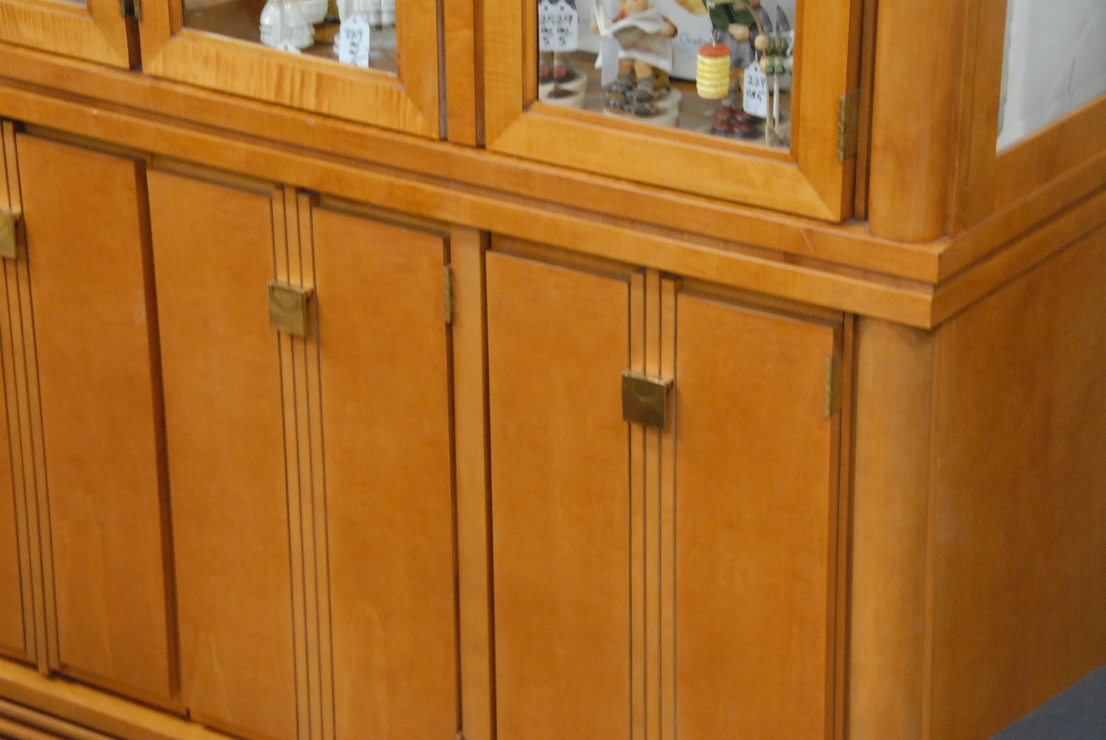 Hickory White breakfront with four beveled glass doors, glass shelves, and mirrored back