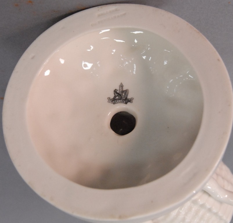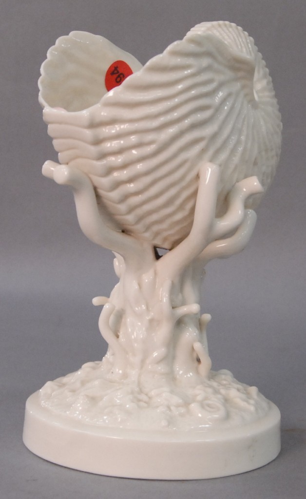 Irish Belleek nautilus shell on footed base, black mark. height 9in.