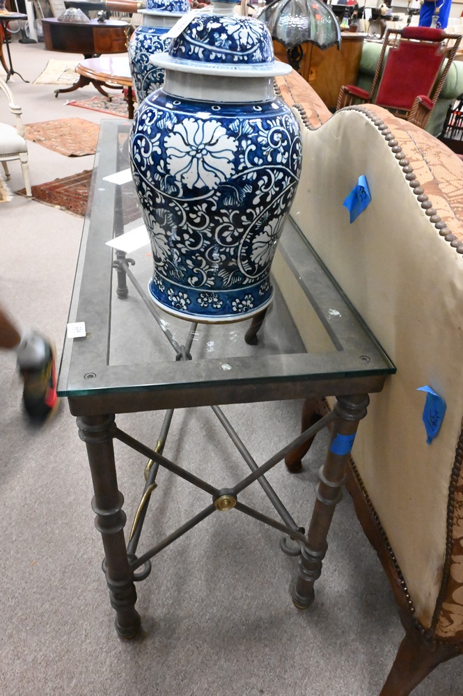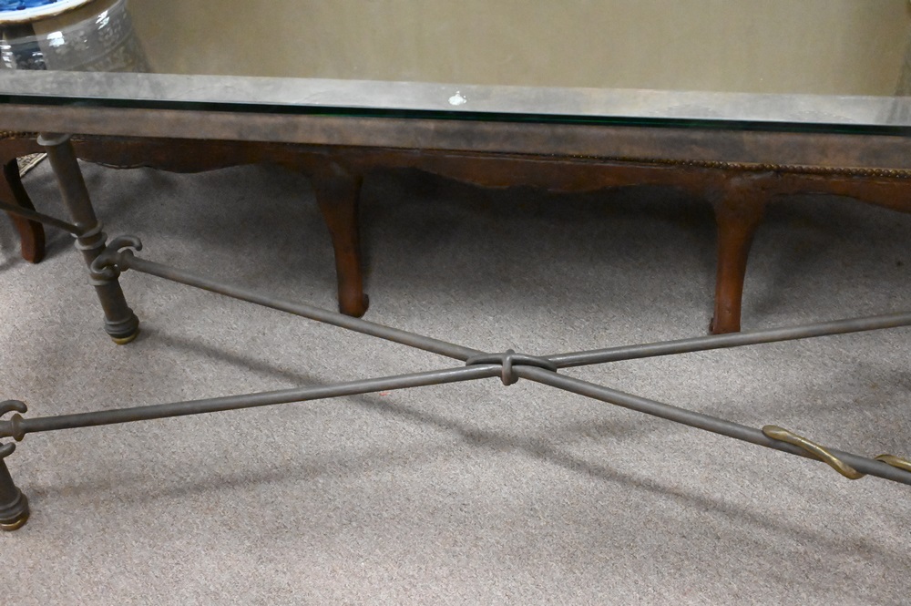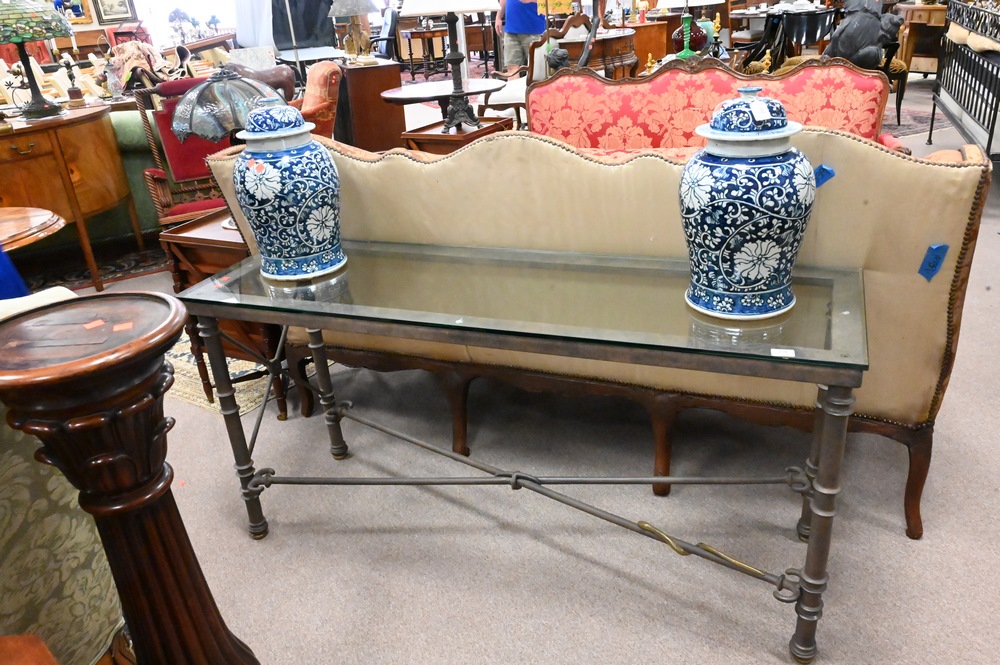 Iron and Glass Top Sofa Table, having brass snake on stretcher along with brass feet, height 29 inches, top 18″ x 60″.