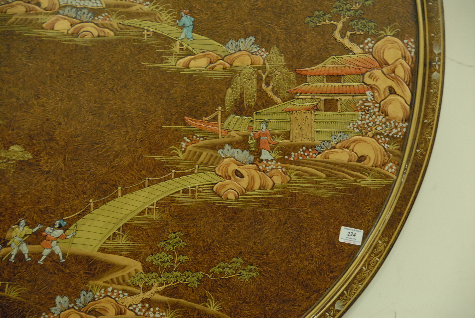 Lot 224: Large round wood Oriental wall hanging, dia. 48 in.