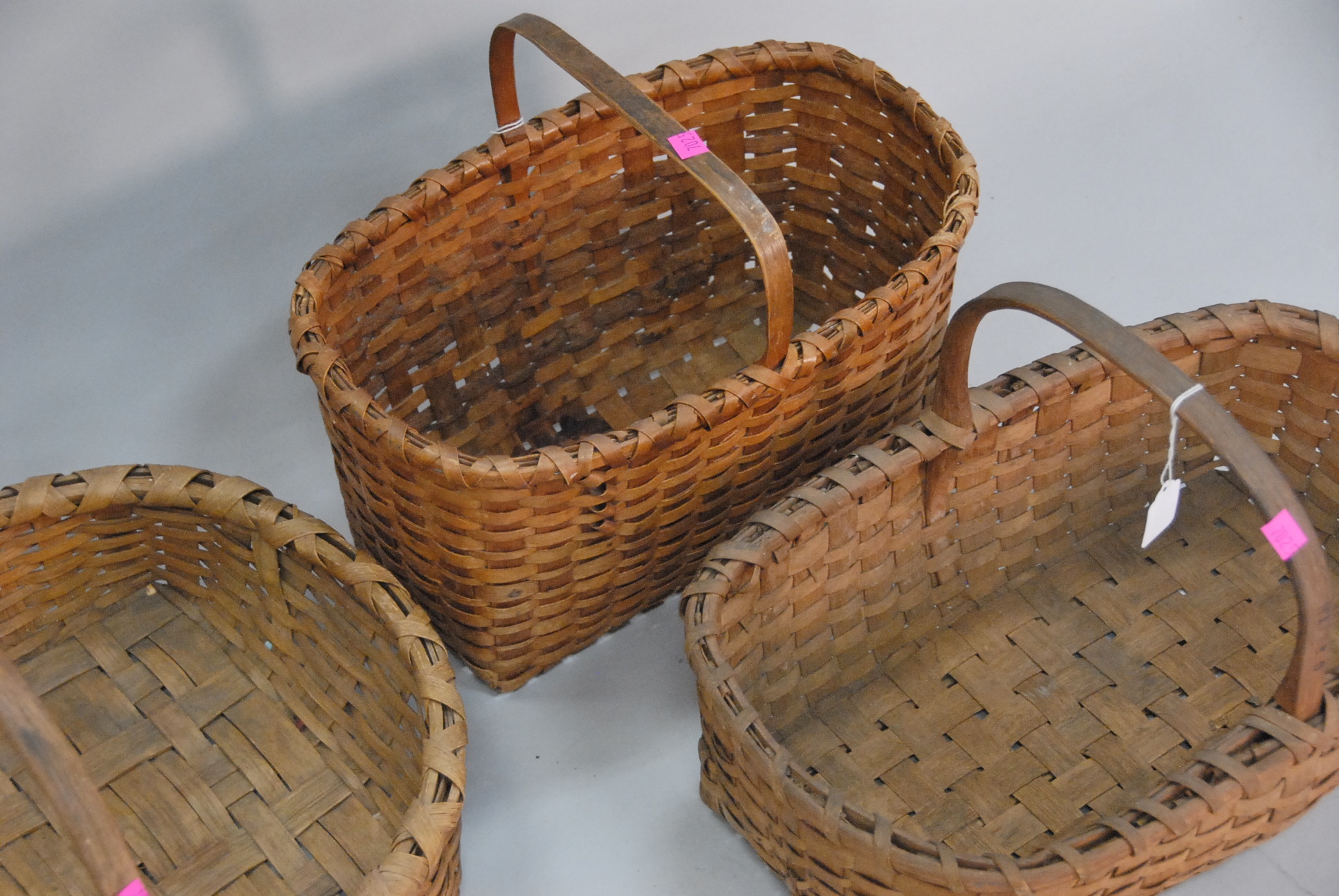 Lot 224: Lot of three rectangle baskets with handles, one marked G. Smith. lg. 17in., 19in., and 22in.
