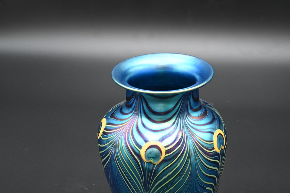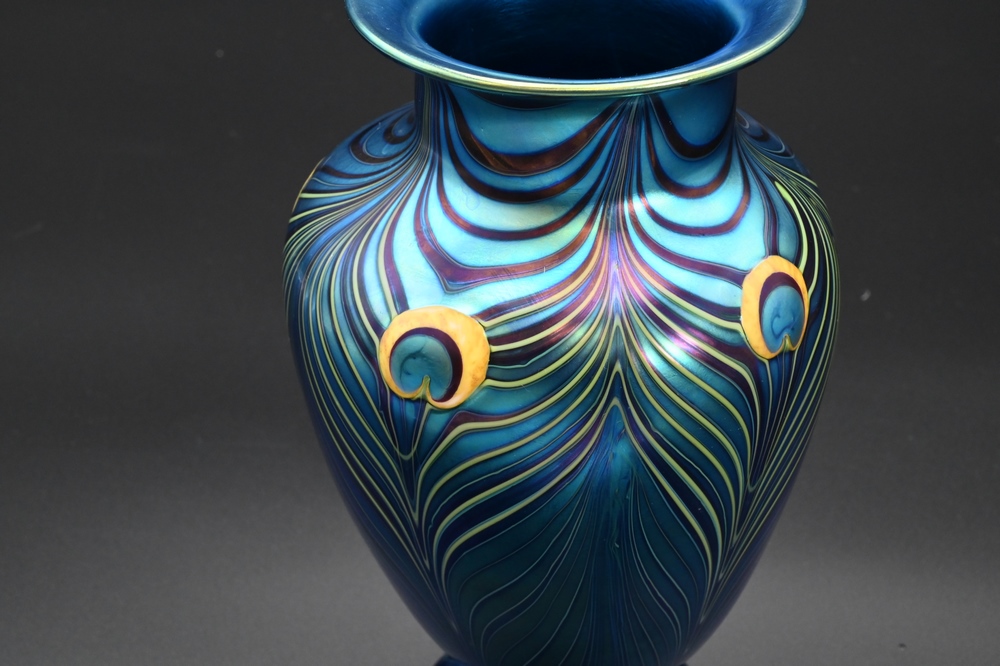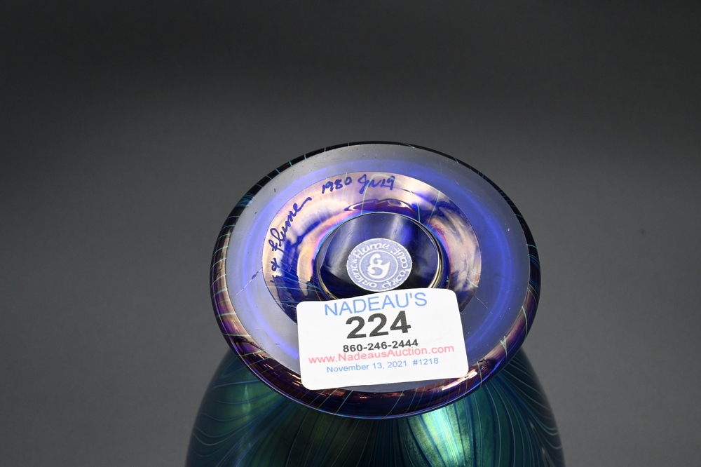 Lot 224: Orient and Flume Cobalt Vase, pull feather design, signed and stickered on bottom, height 8 3/4 inches.