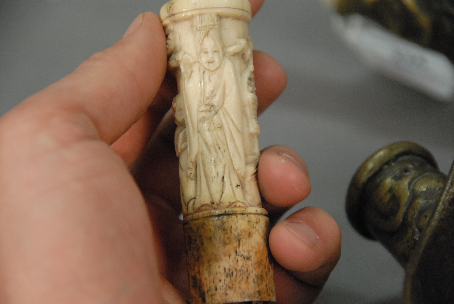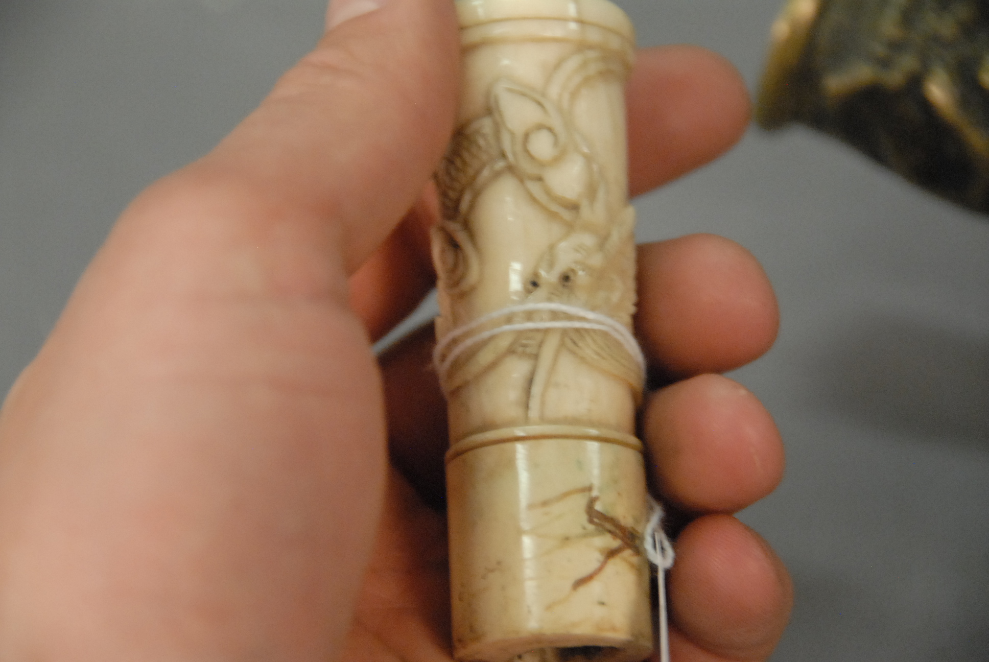 Lot 224: Pair of brass and bone handled heating cups the brass body decorated with Lu symbol and bone handles carved with dragons, China, 19th century. lg. 8 1/2in.
