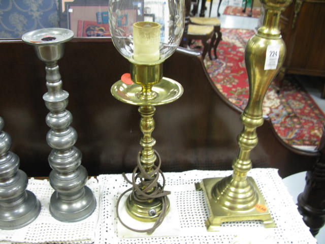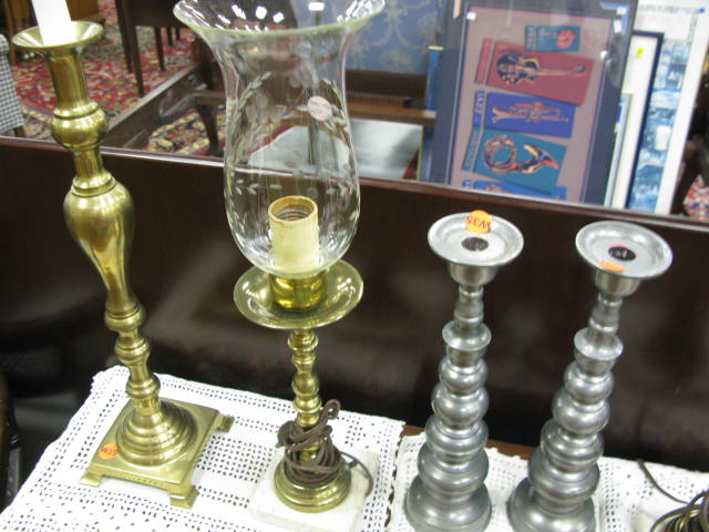 Six piece lot to include two brass candlesticks and two candlestick lamps